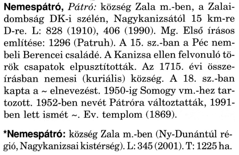 Nyilvános 2419 | 6789 | A szócikk felismertetett szövege: | (A csillag után a kiegészítő kötetből származó szöveg következik) Nemespátró, Pátró: község Zala m.-ben, a Zalaidombság DK-i szélén, Nagykanizsától 15 km-re D-re. L: 828 (1910), 406 (1990). Mg. Első írásos említése: 1296 (Patruh). A 15. sz.-ban a Péc nembeli Berencei családé. A Kanizsa ellen felvonuló török csapatok elpusztították. Az 1715. évi összeírásban nemesi (kuriális) község. A 18. sz.-ban kapta a ~ elnevezést. 1950-ig Somogy vm.-hez tartozott. 1952-ben nevét Pátróra változtatták, 1991-ben lett ismét ~. Ev. templom (1869). *Nemespátró: község Zala m.-ben (Ny-Dunántúl régió, Nagykanizsai kistérség). L: 345 (2001). T: 1225 ha. A szócikkek a következő lexikonból származnak: Cím: Magyar nagylexikon Közreműködő: Élesztős László (1949) (szerk.) ; Barabás Éva (1943) (szerk.) ; Berényi Gábor (1946) (szerk.) ; Bárány Lászlóné (szerk.) ; Adelmann-né Kertész Judit (1945) (közrem.) ; Froemel Károlyné Jáky Éva (1936) (közrem.) ; Akadémiai Kiadó és Nyomda Vállala Szerz. közl.: [... Élesztős László főszerk.] ; [szerk. Barabás Éva et al.] ; [bibliogr. Adelmanné Kertész Judit] ; [kész. az Akadémiai Kiadó Magyar Nagylexikon Szerkesztőségében] Kiadás: Budapest : Akad. K., 1993- Kötetei: 1. köt., A - Anc 2. köt., And - Bag 3. köt., Bah - Bij 4. köt., Bik - Bz 5. köt., C - Csem 6. köt., Csen - Ec 7. köt., Ed - Fe 8. köt., Ff - Gyep 9. köt., Gyer - Iq 10. köt., Ir - Kip 11. köt., Kir - Lem 12. köt., Len - Mep 13. köt., Mer - Nyk 14. köt., Nyl - Pom 15. köt., Pon - Sek 16. köt., Sel - Szö 17. köt., Szp - Ung 18. köt., Unh - Z 19. köt., Kiegészítő kötet, A - Z ETO jelzet: 030=945.11 Szakjelzet: 030 Cutter: M 14 ISBN: 963-05-6611-7 [!ISBN 963-05-6615-X] Nyelv: magyar Megjegyzés: Az 5. kötettől kiad. a Magyar Nagylexikon Kiadó ; A 6. kötettől főszerk. Berényi Gábor ; A 6. kötettől szakszerk. Bárány Lászlóné et al. ; A 6. kötettől bibliogr. Froemel Károlyné ; Bibliogr. a szócikkek végén |