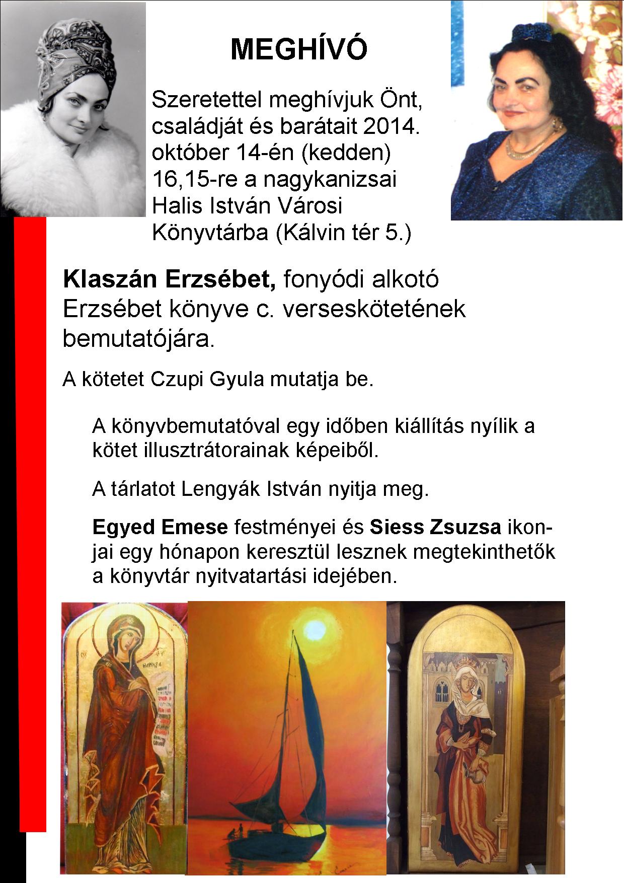 Nyilvános 1523 | 2156 | MEGHÍVÓ | Szeretettel meghívjuk Önt, családját és barátait 2014. október 14-én (kedden) 16,15-re a nagykanizsai Halis István Városi Könyvtárba (Kálvin tér 5.) Klaszán Erzsébet, fonyódi alkotó Erzsébet könyve c. verseskötetének bemutatójára. A kötetet Czupi Gyula mutatja be. A könyvbemutatóval egy időben kiállítás nyílik a kötet illusztrátorainak képeiből. A tárlatot Lengyák István nyitja meg. Egyed Emese festményei és Siess Zsuzsa ikonjai egy hónapon keresztül lesznek megtekinthetők a könyvtár nyitvatartási idejében. |