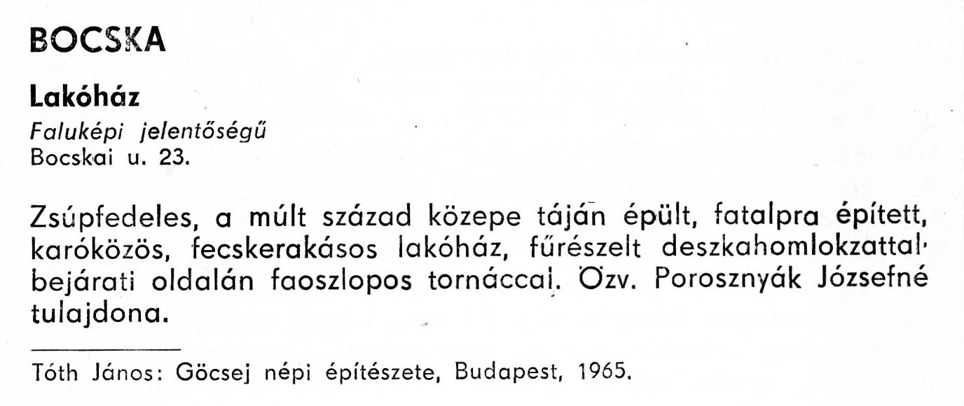 Nyilvános 2609 | 6425 | Bocska - Zala megye műemlékei 1977 046old | A részlet szövege: BOCSKA Lakóház Faluképi jelentőségű Bocskai u. 23. Zsúpfedeles, a múlt század közepe táján épült, fatalpra épített, karóközös, fecskerakásos lakóház, fűrészelt deszkahomlokzattal, bejárati oldalán faoszlopos tornáccal, özv. Porosznyák Józsefné tulajdona. Tóth János: Göcsej népi építészete, Budapest, 1965. A részlet a következő könyvből származik: Cím: Zala megye műemlékei Szerző: Németh József (1928) Közreműködő: Lantos Miklós (fotó) Szerz. közl.: Németh József ; [fotók... Lantos Miklós] Kiadás: Zalaegerszeg : Zalai Ny., 1977 ETO jelzet: 72(439.121) ; 7.025.3/.4 ; 908.439.121 Tárgyszó: Zala megye Szakjelzet: 908 Cutter: N 53 Nyelv: magyar Oldalszám: 109 p. |