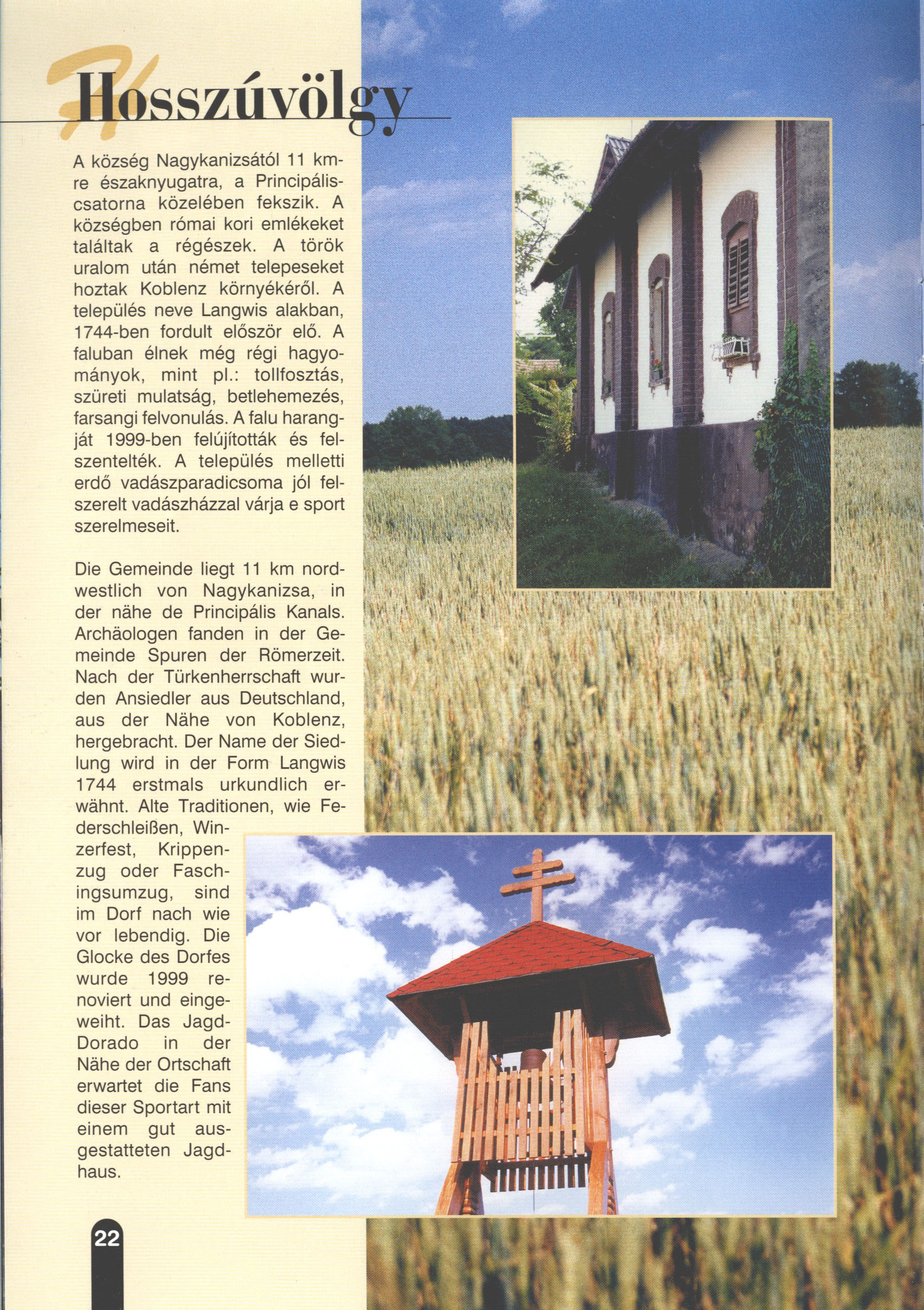 Nyilvános 2493 | 6189 | Hosszúvölgy | Die Gemeinde liegt 11 km nordwestlich von Nagykanizsa, in der nähe de Principális Kanals. Archäologen fanden in der Gemeinde Spuren der Römerzeit. Nach der Türkenherrschaft wurden Ansiedler aus Deutschland, aus der Nähe von Koblenz, hergebracht. Der Name der Siedlung wird in der Form Langwis 1744 erstmals urkundlich erwähnt. Alte Traditionen, wie Federschleißen, Winzerfest, Krippenzug oder Faschingsumzug, sind im Dorf nach wie vor lebendig. Die Glocke des Dorfes wurde 1999 renoviert und eingeweiht. Das Jagd-Dorado in der Nähe der Ortschaft erwartet die Fans dieser Sportart mit einem gut ausgestatteten Jagdhaus. Dieses Text stammt von: Titel: Hívogató a Régiók Kapujában - Útikönyv Látnivalók Nagykanizsán és Térségében (Einladend in dem Tor des Gebiets - Reisebuch - Sehenswürdigkeiten in Nagykanizsa und Umgebung) Herausgegeben von: Nagykanizsa és a Környező Települések Területfejlesztési Társulása (Verein für Gebietsentwicklung in Nagykanizsa und in ihrer Umgebung) 8800 Nagykanizsa, Petőfi Sándor út 5. Tel.: 06 93/536-453 • 06 93/536-454 Tel ./Fax: 06 93/326-323 E-mail: terstars@axelero.hu www.kanizsaterseg.celodin.hu |