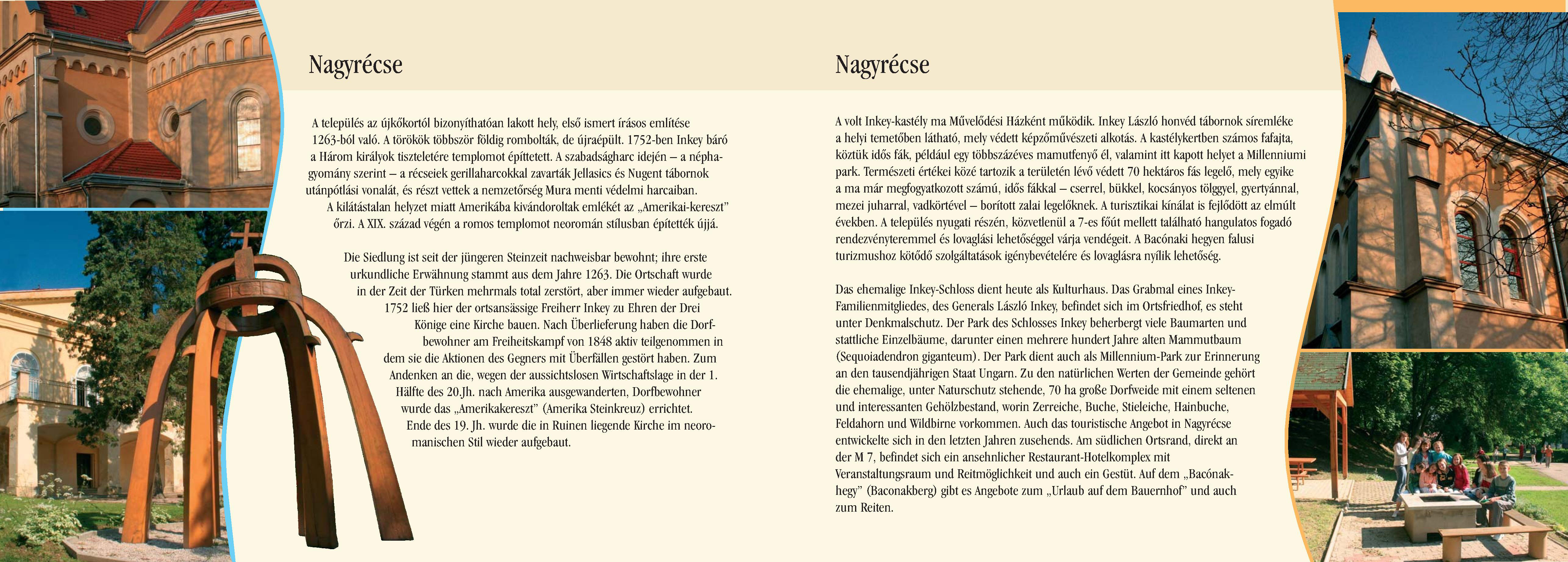 Nyilvános 2719 | 7093 | Nagyrécse | Die Siedlung ist seit der jüngeren Steinzeit nachweisbar bewohnt; ihre erste urkundliche Erwähnung stammt aus dem Jahre 1263. Die Ortschaft wurde in der Zeit der Türken mehrmals total zerstört, aber immer wieder aufgebaut.1752 ließ hier der ortsansässige Freiherr Inkey zu Ehren der Drei Könige eine Kirche bauen. Nach Überlieferung haben die Dorfbewohner am Freiheitskampf von 1848 aktiv teilgenommen in dem sie die Aktionen des Gegners mit Überfällen gestört haben. Zum Andenken an die, wegen der aussichtslosen Wirtschaftslage in der 1. Hälfte des 20.Jh. nach Amerika ausgewanderten, Dorfbewohner wurde das ,,Amerikakereszt" (Amerika Steinkreuz) errichtet. Ende des 19. Jh. wurde die in Ruinen liegende Kirche im neoromanischen Stil wieder aufgebaut. Das ehemalige Inkey-Schloss dient heute als Kulturhaus. Das Grabmal eines Inkey-Familienmitgliedes, des Generals László Inkey, befindet sich im Ortsfriedhof, es steht unter Denkmalschutz. Der Park des Schlosses Inkey beherbergt viele Baumarten und stattliche Einzelbäume, darunter einen mehrere hundert Jahre alten Mammutbaum (Sequoiadendron giganteum). Der Park dient auch als Millennium-Park zur Erinnerung an den tausendjährigen Staat Ungarn. Zu den natürlichen Werten der Gemeinde gehört die ehemalige, unter Naturschutz stehende, 70 ha große Dorfweide mit einem seltenen und interessanten Gehölzbestand, worin Zerreiche, Buche, Stieleiche, Hainbuche, Feldahorn und Wildbirne vorkommen. Auch das touristische Angebot in Nagyrécse entwickelte sich in den letzten Jahren zusehends. Am südlichen Ortsrand, direkt an der M 7, befindet sich ein ansehnlicher Restaurant-Hotelkomplex mit Veranstaltungsraum und Reitmöglichkeit und auch ein Gestüt. Auf dem ,,Bacónak-hegy" (Baconakberg) gibt es Angebote zum ,,Urlaub auf dem Bauernhof" und auch zum Reiten. Dieses Text stammt von: Pannonhát tájpark prospektus 2006. Web: http://www.pannonhat.hu/ (auch in Deutsch) |