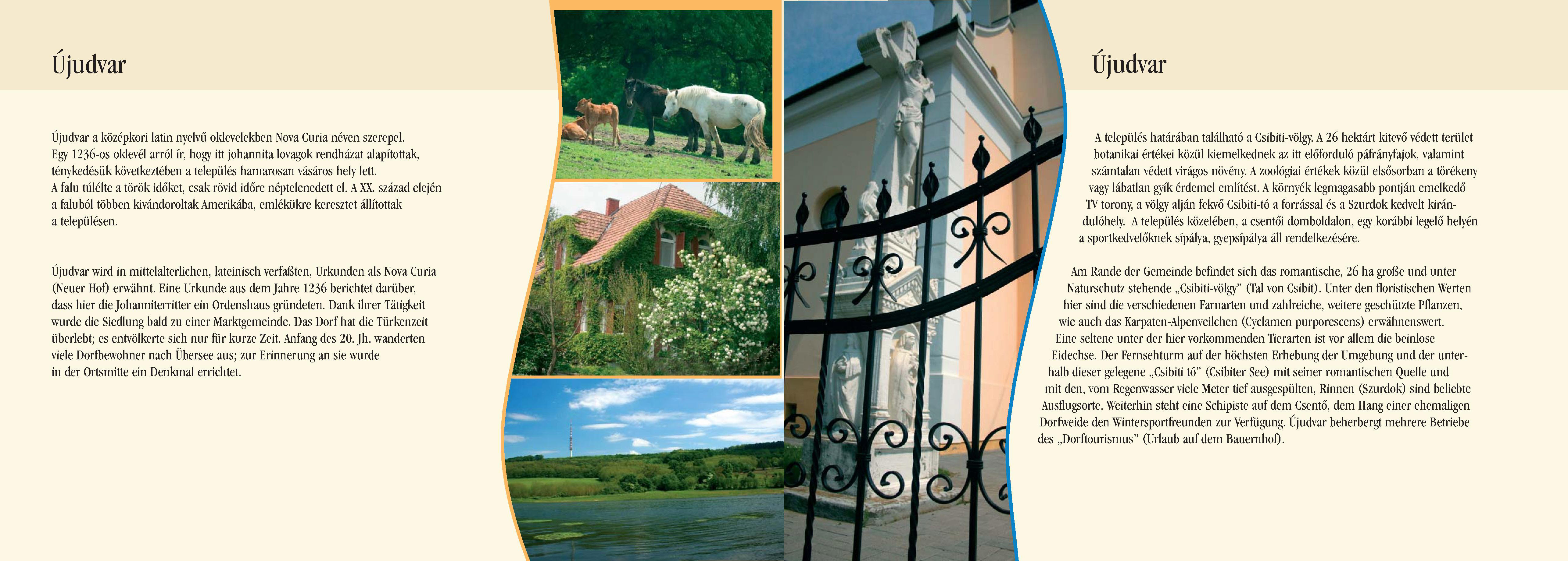 Nyilvános 2703 | 8693 | Újudvar | Újudvar wird in mittelalterlichen, lateinisch verfaßten, Urkunden als Nova Curia (Neuer Hof) erwähnt. Eine Urkunde aus dem Jahre 1236 berichtet darüber, dass hier die Johanniterritter ein Ordenshaus gründeten. Dank ihrer Tätigkeit wurde die Siedlung bald zu einer Marktgemeinde. Das Dorf hat die Türkenzeit überlebt; es entvölkerte sich nur für kurze Zeit. Anfang des 20. Jh. wanderten viele Dorfbewohner nach Übersee aus; zur Erinnerung an sie wurde in der Ortsmitte ein Denkmal errichtet. Am Rande der Gemeinde befindet sich das romantische, 26 ha große und unter Naturschutz stehende ,,Csibiti-völgy" (Tal von Csibit). Unter den floristischen Werten hier sind die verschiedenen Farnarten und zahlreiche, weitere geschützte Pflanzen, wie auch das Karpaten-Alpenveilchen (Cyclamen purporescens) erwähnenswert. Eine seltene unter der hier vorkommenden Tierarten ist vor allem die beinlose Eidechse. Der Fernsehturm auf der höchsten Erhebung der Umgebung und der unterhalb dieser gelegene ,,Csibiti tó" (Csibiter See) mit seiner romantischen Quelle und mit den, vom Regenwasser viele Meter tief ausgespülten, Rinnen (Szurdok) sind beliebte Ausflugsorte. Weiterhin steht eine Schipiste auf dem Csentő, dem Hang einer ehemaligen Dorfweide den Wintersportfreunden zur Verfügung. Újudvar beherbergt mehrere Betriebe des ,,Dorftourismus" (Urlaub auf dem Bauernhof). Dieses Text stammt von: Pannonhát tájpark prospektus 2006. Web: http://www.pannonhat.hu/ (auch in Deutsch) |