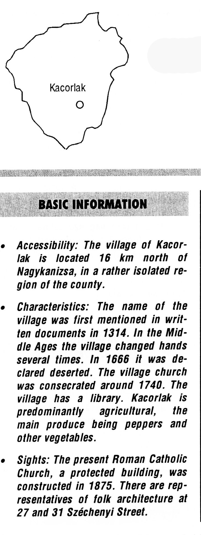 Nyilvános 2928 | 7930 | Rövid leírás | Teljes leírás (1.12 KB) | Kacorlak BASIC INFORMATION Accessibility: The village of Kacorlak is located 16 km north of Nagykanizsa, in a rather isolated region of the county. Characteristics: The name of the village was first mentioned in written documents in 1314. In the Middle Ages the village changed hands several times. In 1666 it was declared deserted. The village church was consecrated around 1740. The village has a library. Kacorlak is predominantly agricultural, the main produce being peppers and other vegetables. Sights: The present Roman Catholic Church, a protected building, was constructed in 1875. There are representatives of folk architecture at 27 and 31 Széchenyi Street. This text came from the following book: Title: Handbook of Zala county (Zala megye kézikönyve) Series: County handbooks of Hungary (Magyarország megyei kézikönyvei) Chief editor: Hóbor József Publisher: (Hatvan), CEBA-Hungary Ltd, 1998 ETO: 908.439.121(035) ; 050.8(439.121) ISBN: 963-9089-18-2 Pages: 488-1040 p. Remark: Closed on: 1998. márc. 31. |