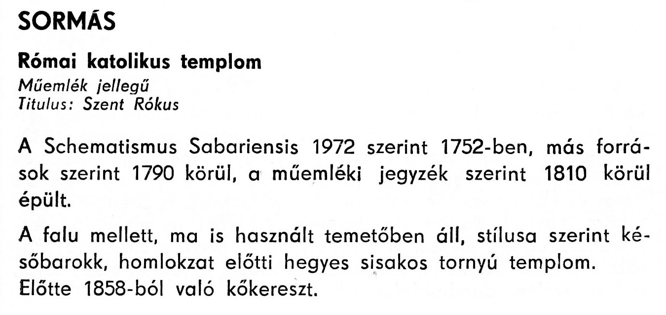 Nyilvános 2218 | 4255 | Sormás - Zala megye műemlékei 1977 083old | A részlet szövege: SORMÁS Római katolikus templom Műemlék jellegű Titulus: Szent Rókus A Schematismus Sabariensis 1972 szerint 1752-ben, más források szerint 1790 körül, a műemléki jegyzék szerint 1810 körül épült. A falu mellett, ma is használt temetőben áll, stílusa szerint későbarokk, homlokzat előtti hegyes sisakos tornyú templom. Előtte 1858-ból való kőkereszt. A részlet a következő könyvből származik: Cím: Zala megye műemlékei Szerző: Németh József (1928) Közreműködő: Lantos Miklós (fotó) Szerz. közl.: Németh József ; [fotók... Lantos Miklós] Kiadás: Zalaegerszeg : Zalai Ny., 1977 ETO jelzet: 72(439.121) ; 7.025.3/.4 ; 908.439.121 Tárgyszó: Zala megye Szakjelzet: 908 Cutter: N 53 Nyelv: magyar Oldalszám: 109 p. |