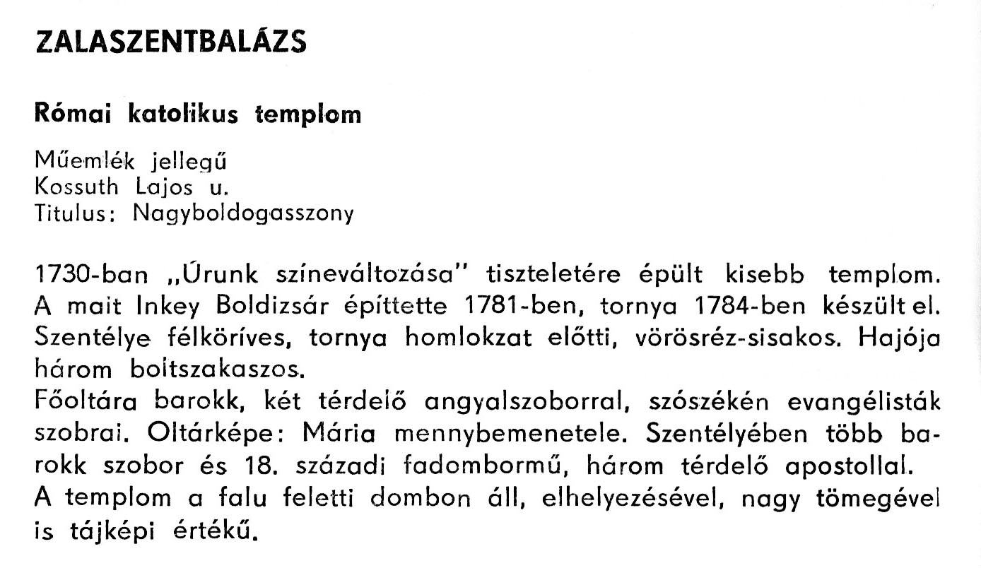 Nyilvános 2188 | 3946 | Zalaszentbalázs - Zala megye műemlékei 1979 122old | A részlet szövege: ZALASZENTBALÁZS Római katolikus templom Műemlék jellegű Kossuth Lajos u. Titulus: Nagyboldogasszony 1730-ban „Urunk színeváltozása" tiszteletére épült kisebb templom. A mait Inkey Boldizsár építtette 1781-ben, tornya 1784-ben készült el. Szentélye félköríves, tornya homlokzat előtti, vörösréz-sisakos. Hajója három boltszakaszos. Főoltára barokk, két térdelő angyalszoborral, szószékén evangélisták szobrai. Oltárképe: Mária mennybemenetele. Szentélyében több barokk szobor és 18. századi fadombormű, három térdelő apostollal. A templom a falu feletti dombon áll, elhelyezésével, nagy tömegével is tájképi értékű. A részlet a következő könyvből származik: Cím: Zala megye műemlékei Szerző: Németh József (1928) Közreműködő: Vándor László (szerk.) ; Szabóky Zsolt (1941) (fotó) Szerz. közl.: Németh József ; [szerk. Vándor László] ; [fotók... Szabóky Zsolt] Kiadás jelzés: 2. bőv. kiad. Kiadás: Zalaegerszeg : Zalai Ny., 1979 ETO jelzet: 72(439.121) ; 7.025.3/.4(439.121) ; 908.439.121 Tárgyszó: Zala Szakjelzet: 908 Cutter: N 53 Nyelv: magyar Oldalszám: 134 p. |