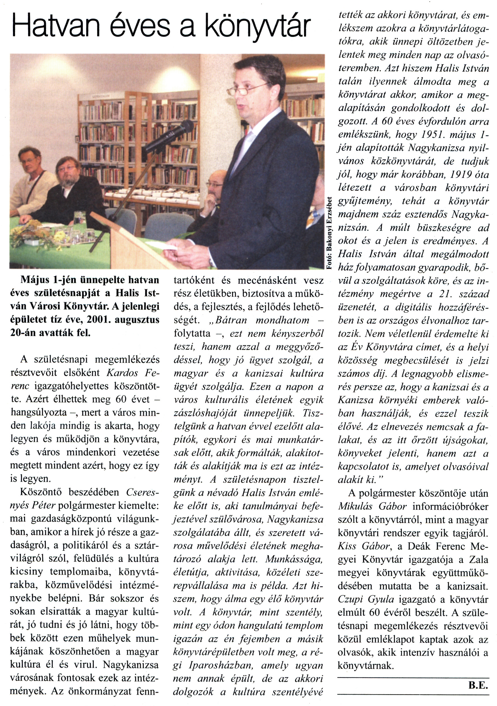 Nyilvános 3004 | 8792 | Kanizsa 2011. május 5. 17. szám 5. oldal - Hatvan éves a könyvtár | A cikk szövege: Hatvan éves a könyvtár Május l-jén ünnepelte hatvan éves születésnapját a Halis István Városi Könyvtár. A jelenlegi épületet tíz éve, 2001. augusztus 20-án avatták fel. A születésnapi megemlékezés résztvevőit elsőként Kardos Ferenc igazgatóhelyettes köszöntötte. Azért élhettek meg 60 évet -hangsúlyozta -, mert a város minden lakója mindig is akarta, hogy legyen és működjön a könyvtára, és a város mindenkori vezetése megtett mindent azért, hogy ez így is legyen. Köszöntő beszédében Cseresnyés Péter polgármester kiemelte: mai gazdaságközpontú világunkban, amikor a hírek jó része a gazdaságról, a politikáról és a sztárvilágról szól, felüdülés a kultúra kicsiny templomaiba, könyvtárakba, közművelődési intézményekbe belépni. Bár sokszor és sokan elsiratták a magyar kultúrát, jó tudni és jó látni, hogy többek között ezen műhelyek munkájának köszönhetően a magyar kultúra él és virul. Nagykanizsa városának fontosak ezek az intézmények. Az önkormányzat fenntartóként és mecénásként vesz rész életükben, biztosítva a működés, a fejlesztés, a fejlődés lehetőségét. „Bátran mondhatom -folytatta -, ezt nem kényszerből teszi, hanem azzal a meggyőződéssel, hogy jó ügyet szolgál, a magyar és a kanizsai kultúra ügyét szolgálja. Ezen a napon a város kulturális életének egyik zászlóshajóját ünnepeljük. Tisztelgünk a hatvan évvel ezelőtt alapítók, egykori és mai munkatársak előtt, akik formálták, alakították és alakítják ma is ezt az intézményt. A születésnapon tisztelgünk a névadó Halis István emléke előtt is, aki tanulmányai befejeztével szülővárosa, Nagykanizsa szolgálatába állt, és szeretett városa művelődési életének meghatározó alakja lett. Munkássága, életútja, aktivitása, közéleti szerepvállalása ma is példa. Azt hiszem, hogy álma egy élő könyvtár volt. A könyvtár, mint szentély, mint egy ódon hangulatú templom igazán az én fejemben a másik könyvtárépületben volt meg, a régi Iparosházban, amely ugyan nem annak épült, de az akkori dolgozók a kultúra szentélyévé tették az akkori könyvtárat, és emlékszem azokra a könyvtárlátogatókra, akik ünnepi öltözetben jelentek meg minden nap az olvasóteremben. Azt hiszem Halis István talán ilyennek álmodta meg a könyvtárat akkor, amikor a megalapításán gondolkodott és dolgozott. A 60 éves évfordulón arra emlékszünk, hogy 1951. május 1-jén alapították Nagykanizsa nyilvános közkönyvtárát, de tudjuk jól, hogy már korábban, 1919 óta létezett a városban könyvtári gyűjtemény, tehát a könyvtár majdnem száz esztendős Nagykanizsán. A múlt büszkeségre ad okot és a jelen is eredményes. A Halis István által megálmodott ház folyamatosan gyarapodik, bővül a szolgáltatások köre, és az intézmény megértve a 21. század üzenetét, a digitális hozzáférésben is az országos élvonalhoz tartozik. Nem véletlenül érdemelte ki az Év Könyvtára címet, és a helyi közösség megbecsülését is jelzi számos díj. A legnagyobb elismerés persze az, hogy a kanizsai és a Kanizsa környéki emberek valóban használják, és ezzel teszik élővé. Az elnevezés nemcsak a falakat, és az itt őrzött újságokat, könyveket jelenti, hanem azt a kapcsolatot is, amelyet olvasóival alakít ki. " A polgármester köszöntője után Mikulás Gábor információbróker szólt a könyvtárról, mint a magyar könyvtári rendszer egyik tagjáról. Kiss Gábor, a Deák Ferenc Megyei Könyvtár igazgatója a Zala megyei könyvtárak együttműködésében mutatta be a kanizsait. Czupi Gyula igazgató a könyvtár elmúlt 60 évéről beszélt. A születésnapi megemlékezés résztvevői közül emléklapot kaptak azok az olvasók, akik intenzív használói a könyvtárnak. |