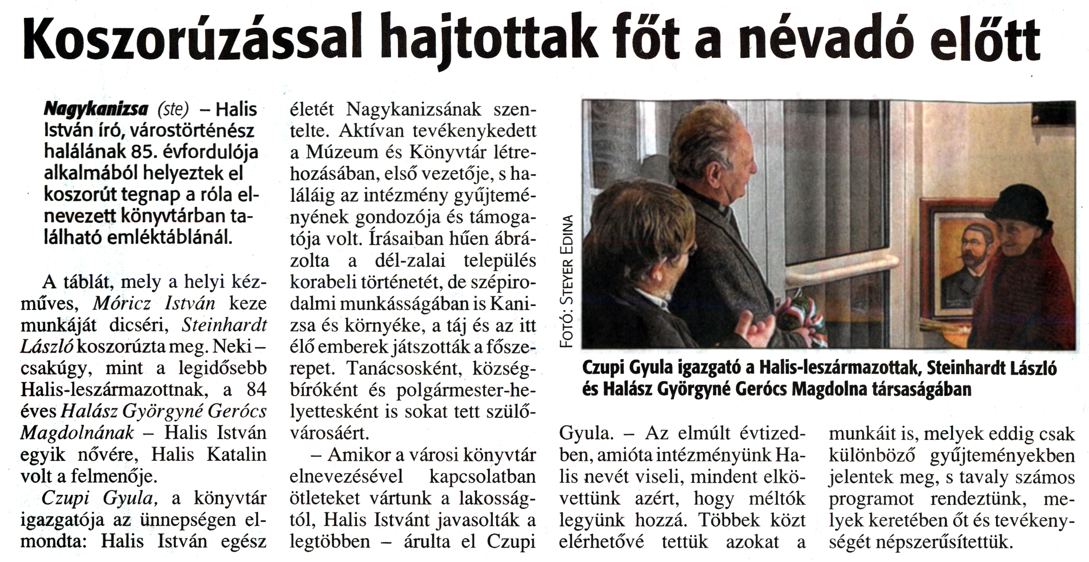 Nyilvános 2201 | 4633 | Zalai Hírlap 2012. február 24. 47. szám 4. oldal - Koszorúzással hajtottak főt a névadó előtt | Koszorúzással hajtottak főt a névadó előtt Nagykanizsa (ste) - Halis István író, várostörténész halálának 85. évfordulója alkalmából helyeztek el koszorút tegnap a róla elnevezett könyvtárban található emléktáblánál. A táblát, mely a helyi kézműves, Móricz István keze munkáját dicséri, Steinhardt László koszorúzta meg. Neki -csakúgy, mint a legidősebb Halis-leszármazottnak, a 84 éves Halász Györgyné Gerócs Magdolnának - Halis István egyik nővére, Halis Katalin volt a felmenője. Czupi Gyula, a könyvtár igazgatója az ünnepségen elmondta: Halis István egész életét Nagykanizsának szentelte. Aktívan tevékenykedett a Múzeum és Könyvtár létrehozásában, első vezetője, s haláláig az intézmény gyűjteményének gondozója és támogatója volt. Írásaiban hűen ábrázolta a dél-zalai település korabeli történetét, de szépirodalmi munkásságában is Kanizsa és környéke, a táj és az itt élő emberek játszották a főszerepet. Tanácsosként, községbíróként és polgármester-helyettesként is sokat tett szülővárosáért. - Amikor a városi könyvtár elnevezésével kapcsolatban ötleteket vártunk a lakosságtól, Halis Istvánt javasolták a legtöbben - árulta el Czupi Gyula. - Az elmúlt évtizedben, amióta intézményünk Halis nevét viseli, mindent elkövettünk azért, hogy méltók legyünk hozzá. Többek közt elérhetővé tettük azokat a munkáit is, melyek eddig csak különböző gyűjteményekben jelentek meg, s tavaly számos programot rendeztünk, melyek keretében őt és tevékenységét népszerűsítettük. Czupi Gyula igazgató a Halis-leszármazottak, Steinhardt László és Halász Györgyné Gerócs Magdolna társaságában Fotó: Steyer Edina |
