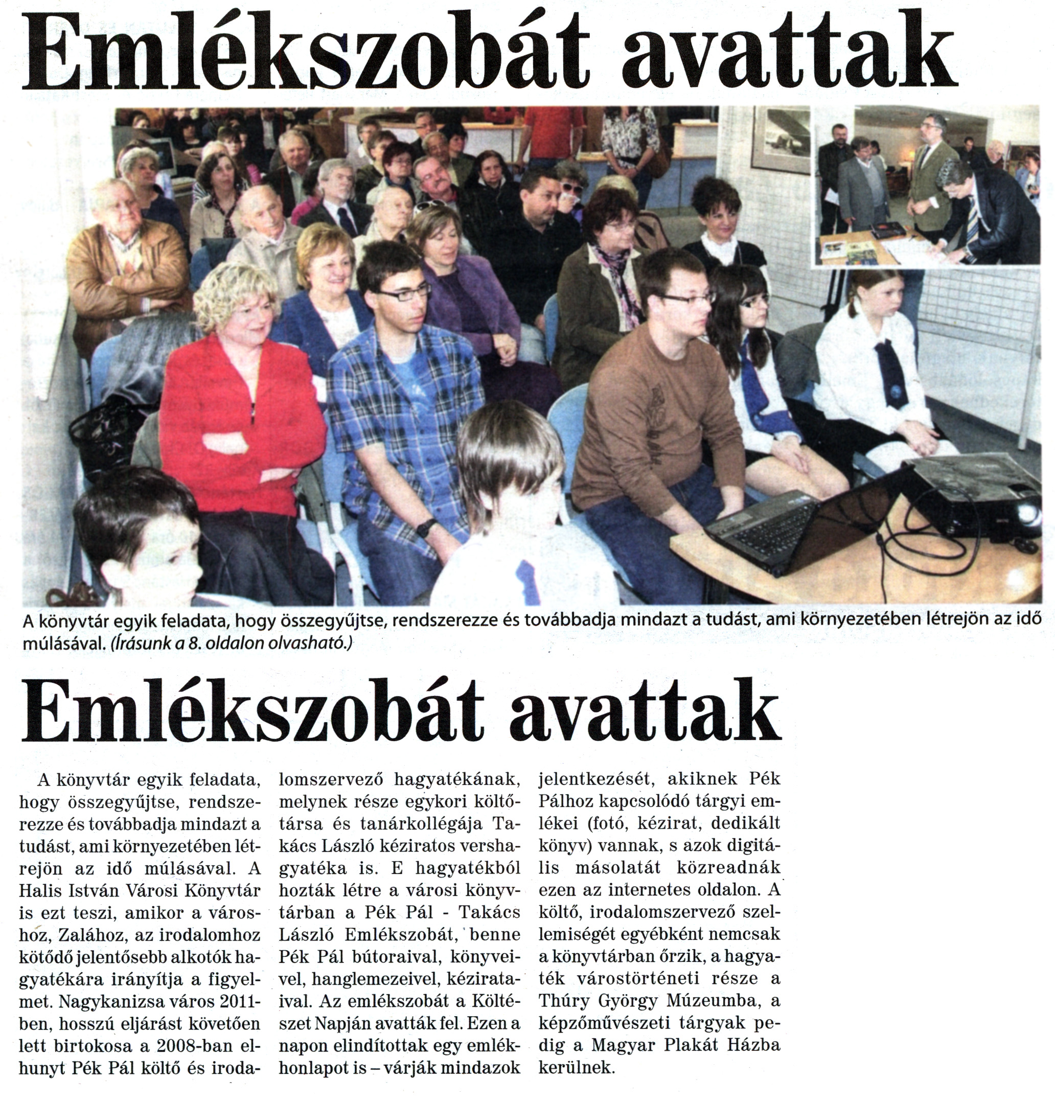 Nyilvános 2275 | 5763 | Nagykanizsai Maraton 2012. április 13. 14. szám 1. és 8. oldal - Emlékszobát avattak | Emlékszobát avattak A könyvtár egyik feladata, hogy összegyűjtse, rendszerezze és továbbadja mindazt a tudást, ami környezetében létrejön az idő múlásával. (Írásunk a 8. oldalon olvasható.) Emlékszobát avattak A könyvtár egyik feladata, hogy összegyűjtse, rendszerezze és továbbadja mindazt a tudást, ami környezetében létrejön az idő múlásával. A Halis István Városi Könyvtár is ezt teszi, amikor a városhoz, Zalához, az irodalomhoz kötődő jelentősebb alkotók hagyatékára irányítja a figyelmet. Nagykanizsa város 2011-ben, hosszú eljárást követően lett birtokosa a 2008-ban elhunyt Pék Pál költő és irodalomszervező hagyatékának, melynek része egykori költőtársa és tanárkollégája Takács László kéziratos vershagyatéka is. E hagyatékból hozták létre a városi könyvtárban a Pék Pál - Takács László Emlékszobát, benne Pék Pál bútoraival, könyveivel, hanglemezeivel, kézirataival. Az emlékszobát a Költészet Napján avatták fel. Ezen a napon elindítottak egy emlékhonlapot is - várják mindazok jelentkezését, akiknek Pék Pálhoz kapcsolódó tárgyi emlékei (fotó, kézirat, dedikált könyv) vannak, s azok digitális másolatát közreadnák ezen az internetes oldalon. A költő, irodalomszervező szellemiségét egyébként nemcsak a könyvtárban őrzik, a hagyaték várostörténeti része a Thúry György Múzeumba, a képzőművészeti tárgyak pedig a Magyar Plakát Házba kerülnek. |