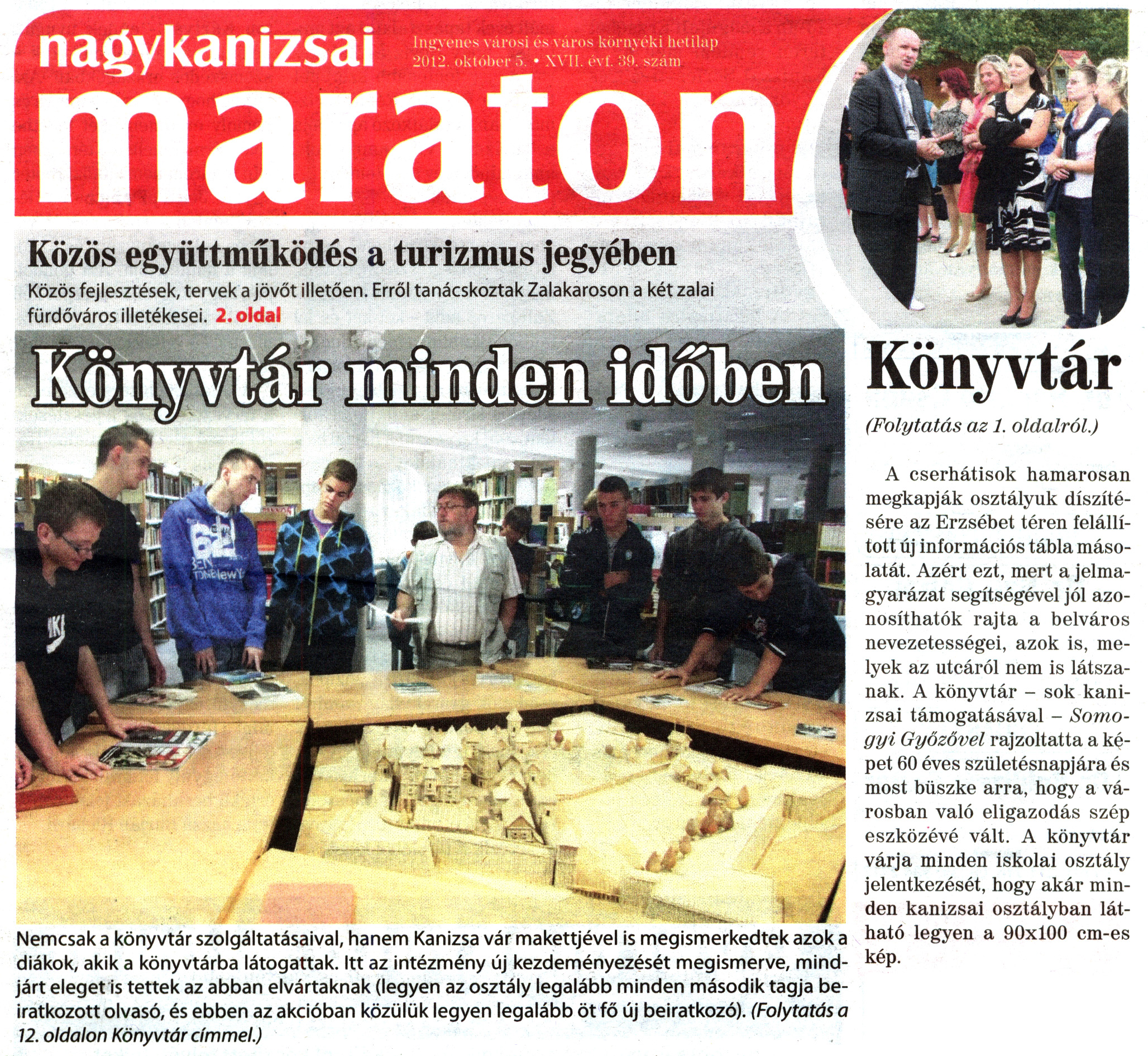 Nyilvános 2235 | 4998 | Nagykanizsai Maraton 2012. október 5. 39. szám 1. oldal - Könyvtár minden időben | Nemcsak a könyvtár szolgáltatásaival, hanem Kanizsa vár makettjével is megismerkedtek azok a diákok, akik a könyvtárba látogattak. Itt az intézmény új kezdeményezését megismerve, mindjárt eleget is tettek az abban elvártaknak (legyen az osztály legalább minden második tagja beiratkozott olvasó, és ebben az akcióban közülük legyen legalább öt fő új beiratkozó). A cserhátisok hamarosan megkapják osztályuk díszítésére az Erzsébet téren felállított új információs tábla másolatát. Azért ezt, mert a jelmagyarázat segítségével jól azonosíthatók rajta a belváros nevezetességei, azok is, melyek az utcáról nem is látszanak. A könyvtár - sok kanizsai támogatásával - Somogyi Győzővel rajzoltatta a képet 60 éves születésnapjára és most büszke arra, hogy a városban való eligazodás szép eszközévé vált. A könyvtár várja minden iskolai osztály jelentkezését, hogy akár minden kanizsai osztályban látható legyen a 90x100 cm-es kép. |