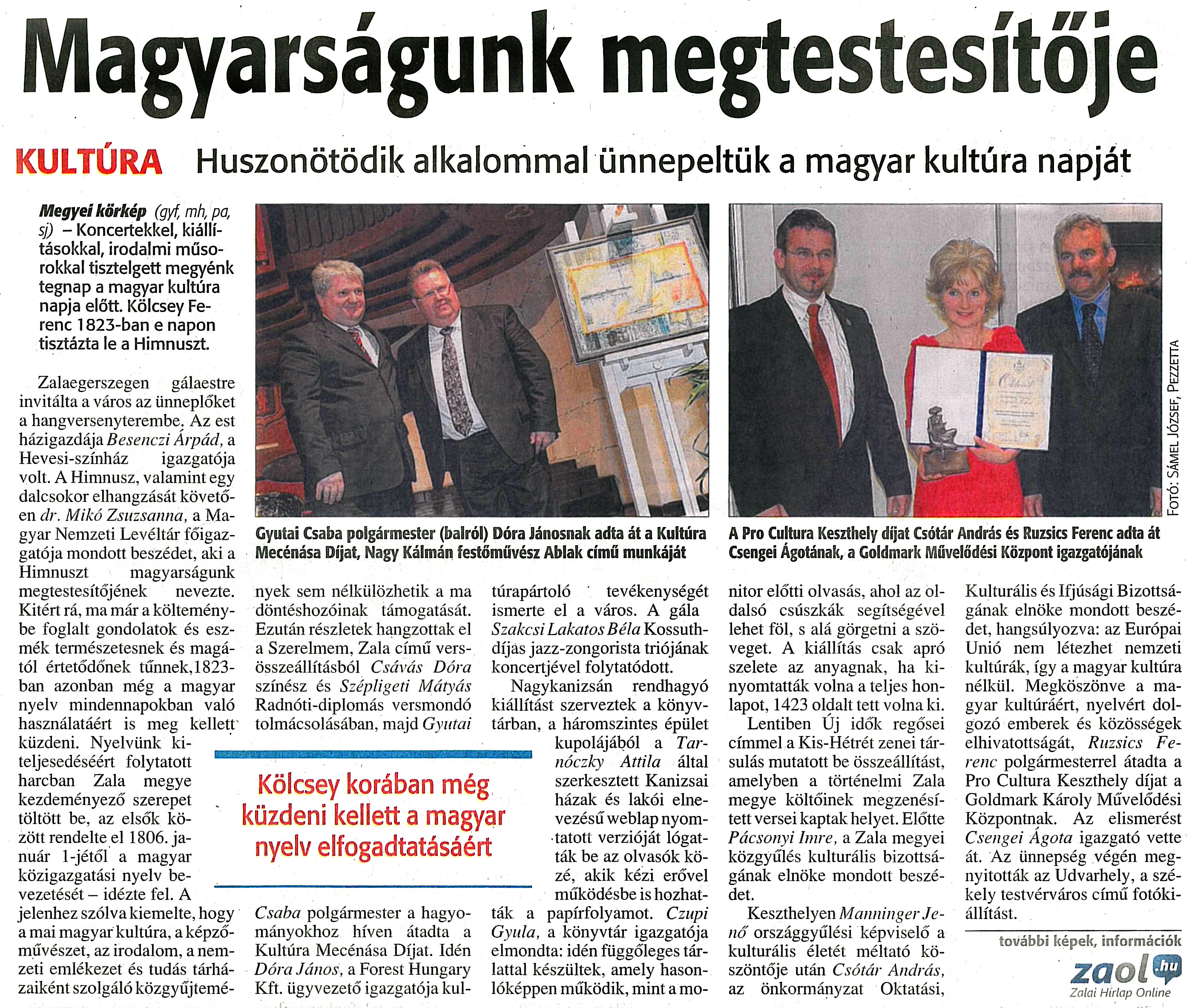 Nyilvános 2153 | 4802 | Zalai Hírlap 2013. január 23. 19. szám 5. oldal - Magyarságunk megtestesítője | Magyarságunk megtestesítője KULTÚRA Huszonötödik alkalommal ünnepeltük a magyar kultúra napját Kölcsey korában még küzdeni kellett a magyar nyelv elfogadtatásáért Megyei körkép (gyf, mh, pa, sj) - Koncertekkel, kiállításokkal, irodalmi műsorokkal tisztelgett megyénk tegnap a magyar kultúra napja előtt. Kölcsey Ferenc 1823-ban e napon tisztázta le a Himnuszt. Zalaegerszegen gálaestre invitálta a város az ünneplőket a hangversenyterembe. Az est házigazdája Besenczi Árpád, a Hevesi-színház igazgatója volt. A Himnusz, valamint egy dalcsokor elhangzását követően dr. Mikó Zsuzsanna, a Magyar Nemzeti Levéltár főigazgatója mondott beszédet, aki a Himnuszt magyarságunk megtestesítőjének nevezte. Kitért rá, ma már a költeménybe foglalt gondolatok és eszmék természetesnek és magától értetődőnek tűnnek, 1823-ban azonban még a magyar nyelv mindennapokban való használatáért is meg kellett küzdeni. Nyelvünk kiteljesedéséért folytatott harcban Zala megye kezdeményező szerepet töltött be. az elsők között rendelte el 1806. január l-jétől a magyar közigazgatási nyelv bevezetését - idézte fel. A jelenhez szólva kiemelte, hogy a mai magyar kultúra, a képzőművészet, az irodalom, a nemzeti emlékezet és tudás tárházaiként szolgáló közgyűjtemények sem nélkülözhetik a ma döntéshozóinak támogatását. Ezután részletek hangzottak el a Szerelmem, Zala című versösszeállításból Csávás Dóra színész és Szépligeti Mátyás Radnóti-diplomás versmondó tolmácsolásában, majd Gyutai Csaba polgármester a hagyományokhoz híven átadta a Kultúra Mecénása Díjat. Idén Dóra János, a Forest Hungary Kft. ügyvezető igazgatója kultúrapártoló tevékenységét ismerte el a város. A gála Szakcsi Lakatos Béla Kossuth-díjas jazz-zongorista triójának koncertjével folytatódott. Nagykanizsán rendhagyó kiállítást szerveztek a könyvtárban, a háromszintes épület kupolájából a Tarnóczky Attila által szerkesztett Kanizsai házak és lakói elnevezésű weblap nyomtatott verzióját lógatták be az olvasók közé, akik kézi erővel működésbe is hozhatták a papírfolyamot. Czupi Gyula, a könyvtár igazgatója elmondta: idén függőleges tárlattal készültek, amely hasonlóképpen működik, mint a monitor előtti olvasás, ahol az oldalsó csúszkák segítségével lehet föl, s alá görgetni a szöveget. A kiállítás csak apró szelete az anyagnak, ha kinyomtatták volna a teljes honlapot, 1423 oldalt tett volna ki. Lentiben Új idők regősei címmel a Kis-Hétrét zenei társulás mutatott be összeállítást, amelyben a történelmi Zala megye költőinek megzenésített versei kaptak helyet. Előtte Pácsonyi Imre, a Zala megyei közgyűlés kulturális bizottságának elnöke mondott beszédet. Keszthelyen Manninger Jenő országgyűlési képviselő a kulturális életét méltató köszöntője után Csótár András, az önkormányzat Oktatási, Kulturális és Ifjúsági Bizottságának elnöke mondott beszédet, hangsúlyozva: az Európai Unió nem létezhet nemzeti kultúrák, így a magyar kultúra nélkül. Megköszönve a magyar kultúráért, nyelvért dolgozó emberek és közösségek elhivatottságát, Ruzsics Ferenc polgármesterrel átadta a Pro Cultura Keszthely díjat a Goldmark Károly Művelődési Központnak. Az elismerést Csengei Ágota igazgató vette át. Az ünnepség végén megnyitották az Udvarhely, a székely testvérváros című fotókiállítást. további képek, információk zaol.hu Zalai Hírlap Online Gyutai Csaba polgármester (balról) Dóra Jánosnak adta át a Kultúra Mecénása Díjat, Nagy Kálmán festőművész Ablak című munkáját A Pro Cultura Keszthely díjat Csótár András és Ruzsics Ferenc adta át Csengei Ágotának, a Goldmark Művelődési Központ igazgatójának Fotó: Sámel József, Pezzetta |