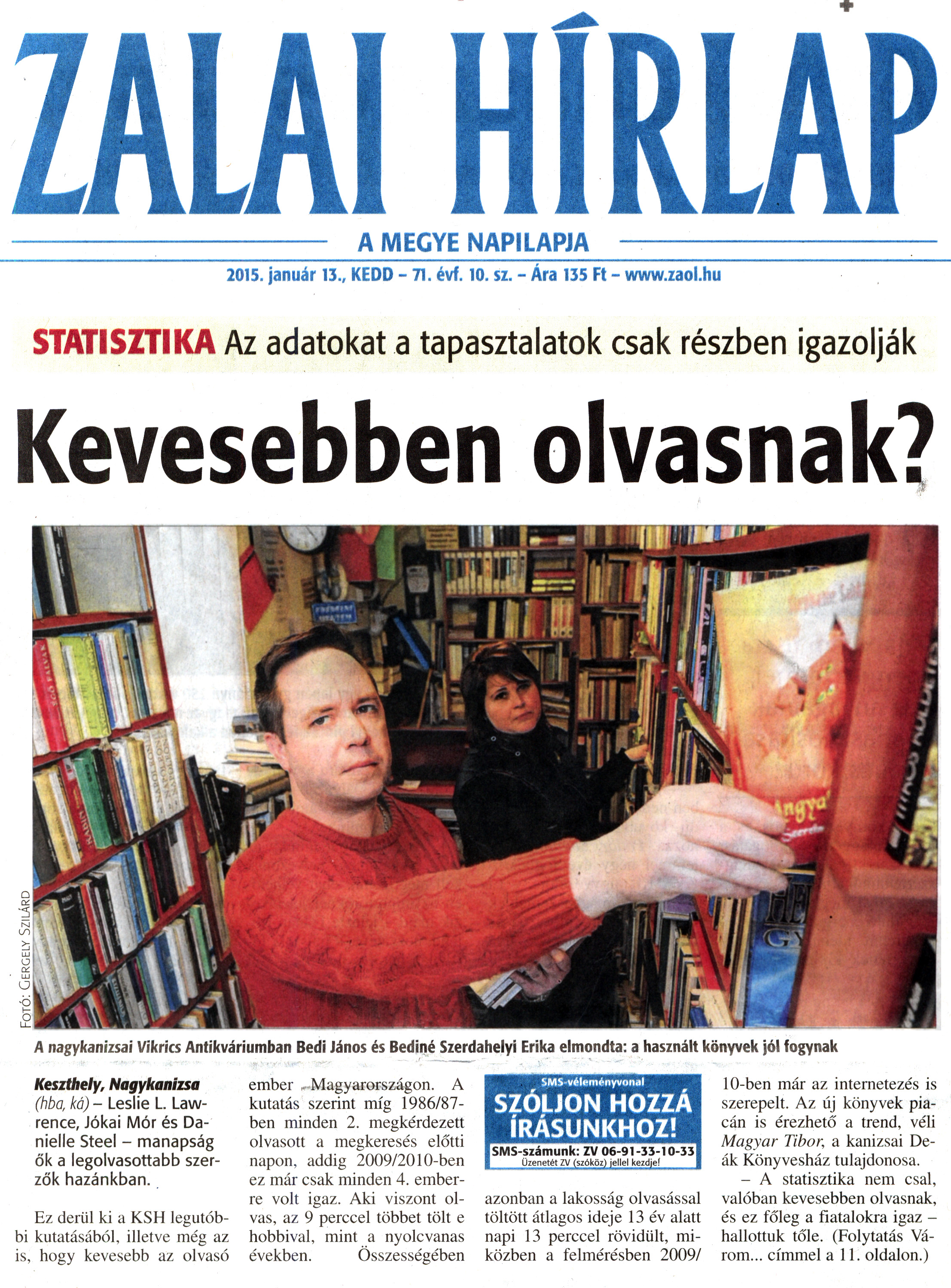 Nyilvános 2083 | 3863 | Zalai Hírlap 2015. január 13. 10. szám 1. oldal - Kevesebben olvasnak | HÍRLAP A MEGYE NAPILAPJA 2015. január 13., KEDD - 71. évf. 10. sz. - Ara 135 Ft - www.zaol.hu STATISZTIKA Az adatokat a tapasztalatok csak részben igazolják Kevesebben olvasnak? A nagykanizsai Vikrics Antikváriumban Bedi János és Bediné Szerdahelyi Erika elmondta: a használt könyvek jól fogynak Keszthely, Nagykanizsa (hba, ka) - Leslie L. Lawrence, Jókai Mór és Danielle Steel - manapság ők a legolvasottabb szerzők hazánkban. Ez derül ki a KSH legutóbbi kutatásából, illetve még az is, hogy kevesebb az olvasó ember Magyarországon. A kutatás szerint míg 1986/87-ben minden 2. megkérdezett olvasott a megkeresés előtti napon, addig 2009/2010-ben ez már csak minden 4. emberre volt igaz. Aki viszont olvas, az 9 perccel többet tölt e hobbival, mint a nyolcvanas években. Összességében azonban a lakosság olvasással töltött átlagos ideje 13 év alatt napi 13 perccel rövidült, miközben a felmérésben 2009/ 10-ben már az internetezés is szerepelt. Az új könyvek piacán is érezhető a trend, véli Magyar Tibor, a kanizsai Deák Könyvesház tulajdonosa. - A statisztika nem csal, valóban kevesebben olvasnak, és ez főleg a fiatalokra igaz - hallottuk tőle. (Folytatás Várom... címmel a 11. oldalon.) |