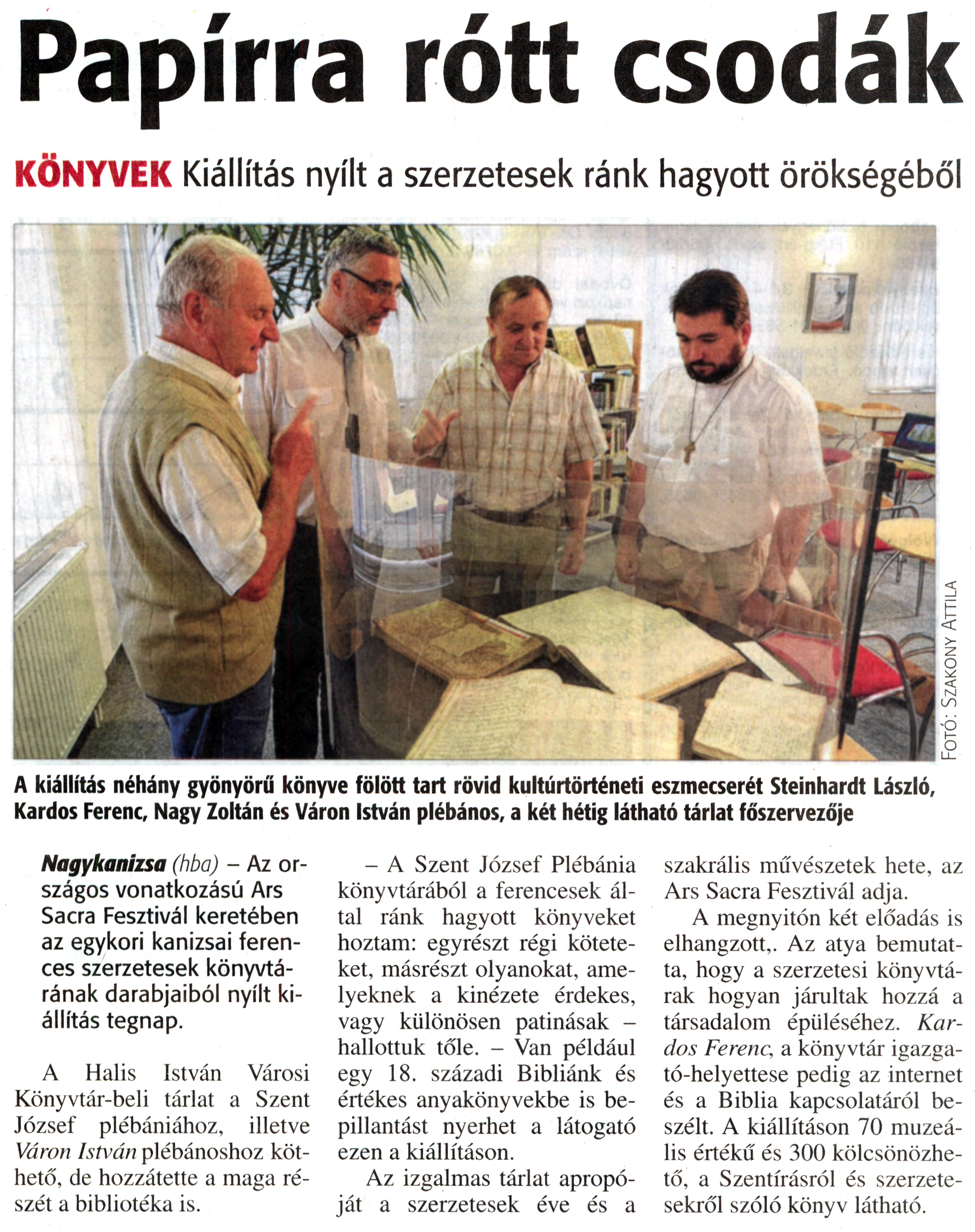 Nyilvános 1850 | 3650 | Zalai Hírlap 2015. szeptember 23. 223. szám 16. oldal | Papírra rótt csodák KÖNYVEK Kiállítás nyílt a szerzetesek ránk hagyott örökségéből A kiállítás néhány gyönyörű könyve fölött tart rövid kultúrtörténeti eszmecserét Steinhardt László, Kardos Ferenc, Nagy Zoltán és Váron István plébános, a két hétig látható tárlat főszervezője Nagykanizsa (hba) - Az országos vonatkozású Ars Sacra Fesztivál keretében az egykori kanizsai ferences szerzetesek könyvtárának darabjaiból nyílt kiállítás tegnap. A Halis István Városi Könyvtár-beli tárlat a Szent József plébániához, illetve Váron István plébánoshoz köthető, de hozzátette a maga részét a bibliotéka is. - A Szent József Plébánia könyvtárából a ferencesek által ránk hagyott könyveket hoztam: egyrészt régi köteteket, másrészt olyanokat, amelyeknek a kinézete érdekes, vagy különösen patinásak -hallottuk tőle. - Van például egy 18. századi Bibliánk és értékes anyakönyvekbe is bepillantást nyerhet a látogató ezen a kiállításon. Az izgalmas tárlat apropóját a szerzetesek éve és a szakrális művészetek hete, az Ars Sacra Fesztivál adja. A megnyitón két előadás is elhangzott. Az atya bemutatta, hogy a szerzetesi könyvtárak hogyan járultak hozzá a társadalom épüléséhez. Kardos Ferenc, a könyvtár igazgató-helyettese pedig az internet és a Biblia kapcsolatáról beszélt. A kiállításon 70 muzeális értékű és 300 kölcsönözhető, a Szentírásról és szerzetesekről szóló könyv látható. |