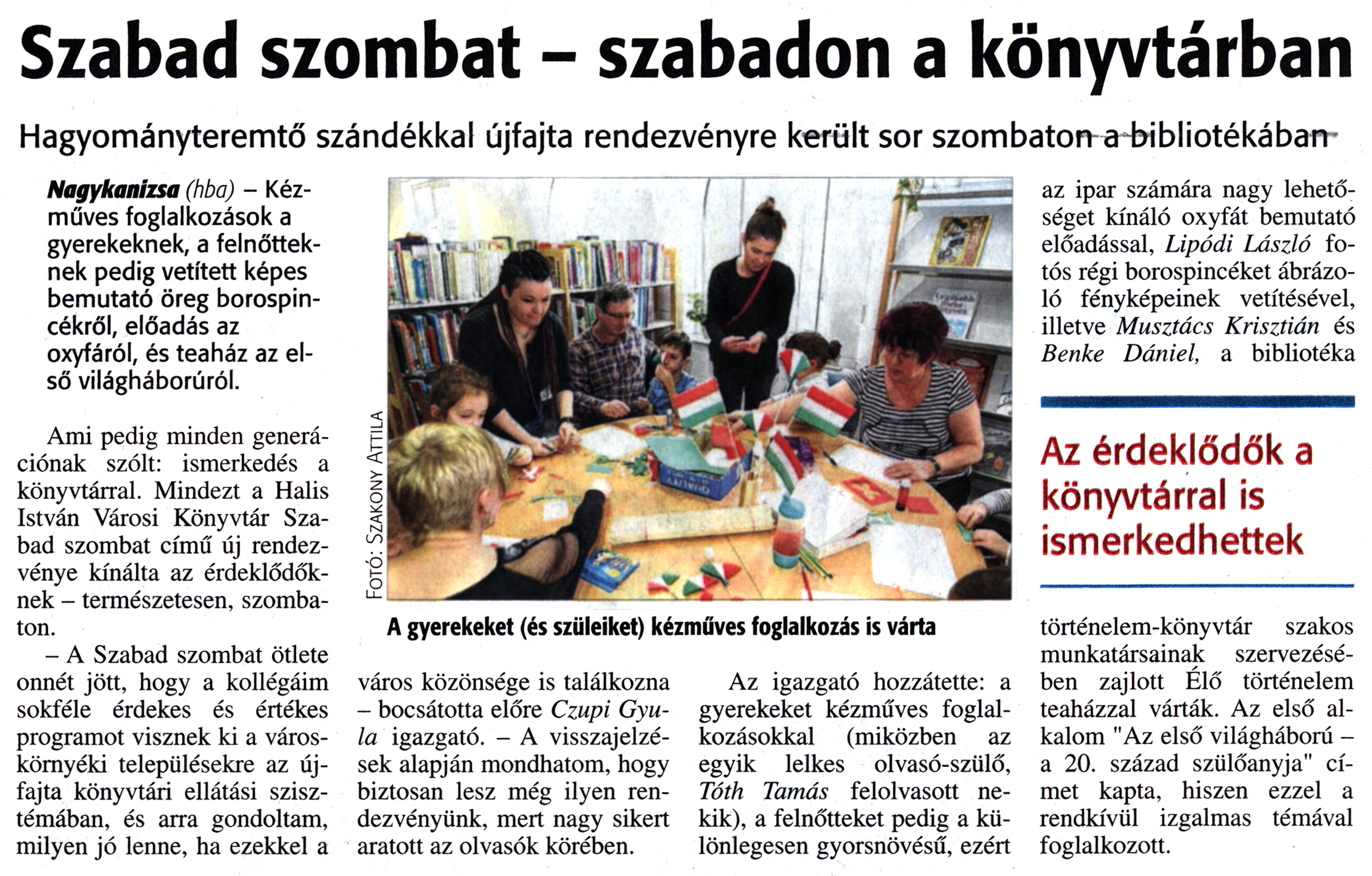 Nyilvános 2163 | 3823 | Zalai Hírlap 2016. február 29. 50. szám 4. oldal | Szabad szombat - szabadon a könyvtárban Hagyományteremtő szándékkal újfajta rendezvényre került sor szombaton a bibliotékában. Nagykanizsa (hba) - Kézműves foglalkozások a gyerekeknek, a felnőtteknek pedig vetített képes bemutató öreg borospincékről, előadás az oxyfáról, és teaház az első világháborúról. Ami pedig minden generációnak szólt: ismerkedés a könyvtárral. Mindezt a Halis István Városi Könyvtár Szabad szombat című új rendezvénye kínálta az érdeklődőknek - természetesen, szombaton. - A Szabad szombat ötlete onnét jött, hogy a kollégáim sokféle érdekes és értékes programot visznek ki a városkörnyéki településekre az újfajta könyvtári ellátási szisztémában, és arra gondoltam, milyen jó lenne, ha ezekkel a A gyerekeket (és szüleiket) kézműves foglalkozás is várta város közönsége is találkozna - bocsátotta előre Czupi Gyula igazgató. - A visszajelzések alapján mondhatom, hogy biztosan lesz még ilyen rendezvényünk, mert nagy sikert aratott az olvasók körében. Az igazgató hozzátette: a gyerekeket kézműves foglalkozásokkal (miközben az egyik lelkes olvasó-szülő, Tóth Tamás felolvasott nekik), a felnőtteket pedig a különlegesen gyorsnövésű, ezért az ipar számára nagy lehetőséget kínáló oxyfát bemutató előadással, Lipódi László fotós régi borospincéket ábrázoló fényképeinek vetítésével, illetve Musztács Krisztián és Benke Dániel, a bibliotéka Az érdeklődők a könyvtárral is ismerkedhettek történelem-könyvtár szakos munkatársainak szervezésében zajlott Élő történelem teaházzal várták. Az első alkalom "Az első világháború -a 20. század szülőanyja" címet kapta, hiszen ezzel a rendkívül izgalmas témával foglalkozott. |