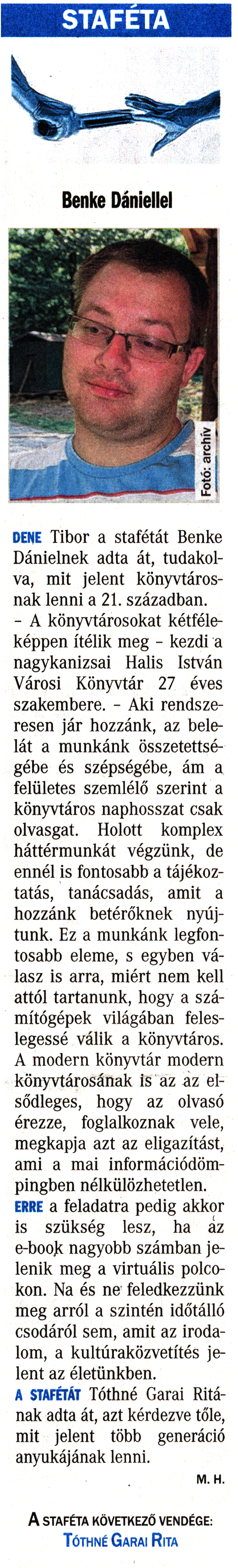 Nyilvános 2344 | 5714 | Vasárnapi Zalai Hírlap 2016. június 5. 20. szám 5. oldal | STAFÉTA DENE Tibor a stafétát Benke Dánielnek adta át, tudakolva, mit jelent könyvtárosnak lenni a 21. században. - A könyvtárosokat kétféleképpen ítélik meg - kezdi a nagykanizsai Halis István Városi Könyvtár 27 éves szakembere. - Aki rendszeresen jár hozzánk, az belelát a munkánk összetettségébe és szépségébe, ám a felületes szemlélő szerint a könyvtáros naphosszat csak olvasgat. Holott komplex háttérmunkát végzünk, de ennél is fontosabb a tájékoztatás, tanácsadás, amit a hozzánk betérőknek nyújtunk. Ez a munkánk legfontosabb eleme, s egyben válasz is arra, miért nem kell attól tartanunk, hogy a számítógépek világában feleslegessé válik a könyvtáros. A modern könyvtár modern könyvtárosának is az az elsődleges, hogy az olvasó érezze, foglalkoznak vele, megkapja azt az eligazítást, ami a mai információdömpingben nélkülözhetetlen. ERRE a feladatra pedig akkor is szükség lesz, ha az e-book nagyobb számban jelenik meg a virtuális polcokon. Na és ne feledkezzünk meg arról a szintén időtálló csodáról sem, amit az irodalom, a kultúraközvetítés jelent az életünkben. A STAFÉTÁT Tóthné Garai Ritának adta át, azt kérdezve tőle, mit jelent több generáció anyukájának lenni. M. H. A staféta következő vendége: Tóthné Garai Rita |