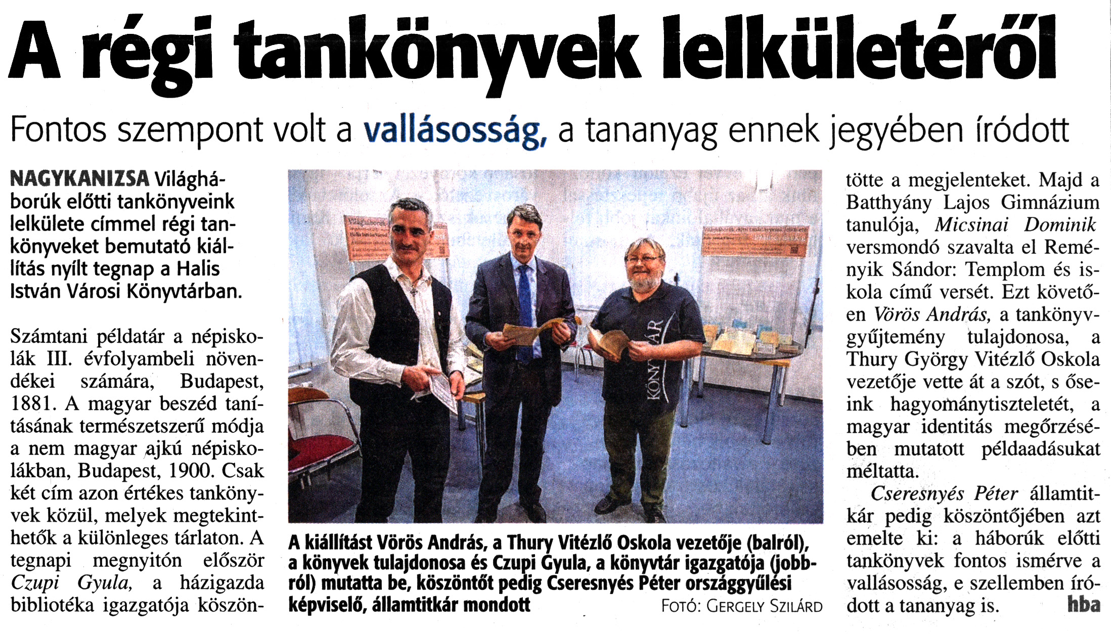 Nyilvános 2036 | 3441 | Zalai Hírlap 2017. október 28. 252. szám 3. oldal | A régi tankönyvek lelkületéről Fontos szempont volt a vallásosság, a tananyag ennek jegyében íródott NAGYKANIZSA Világháborúk előtti tankönyveink lelkülete címmel régi tankönyveket bemutató kiállítás nyílt tegnap a Halis István Városi Könyvtárban. Számtani példatár a népiskolák III. évfolyambeli növendékei számára, Budapest, 1881. A magyar beszéd tanításának természetszerű módja a nem magyar ajkú népiskolákban, Budapest, 1900. Csak két cím azon értékes tankönyvek közül, melyek megtekinthetők a különleges tárlaton. A tegnapi megnyitón először Czupi Gyula, a házigazda bibliotéka igazgatója köszöntötte a megjelenteket. Majd a Batthyány Lajos Gimnázium tanulója, Micsinai Dominik versmondó szavalta el Reményik Sándor: Templom és iskola című versét. Ezt követően Vörös András, a tankönyvgyűjtemény tulajdonosa, a Thury György Vitézlő Oskola vezetője vette át a szót, s őseink hagyománytiszteletét, a magyar identitás megőrzésében mutatott példaadásukat méltatta. Cseresnyés Péter államtitkár pedig köszöntőjében azt emelte ki: a háborúk előtti tankönyvek fontos ismérve a vallásosság, e szellemben íródott a tananyag is. hba A kiállítást Vörös András, a Thury Vitézlő Oskola vezetője (balról), a könyvek tulajdonosa és Czupi Gyula, a könyvtár igazgatója (jobbról) mutatta be, köszöntőt pedig Cseresnyés Péter országgyűlési képviselő, államtitkár mondott Fotó: Gergely Szilárd |