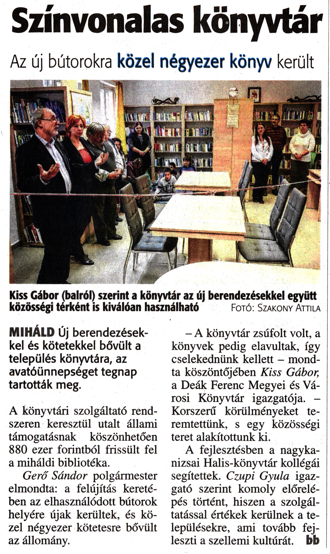Nyilvános 2043 | 3421 | Zalai Hírlap 2017. november 15. 266. szám 4. oldal | Színvonalas könyvtár Az új bútorokra közel négyezer könyv került Kiss Gábor (balról) szerint a könyvtár az új berendezésekkel együtt közösségi térként is kiválóan használható Fotó: Szakony Attila MIHÁLD Új berendezésekkel és kötetekkel bővült a település könyvtára, az avatóünnepséget tegnap tartották meg. A könyvtári szolgáltató rendszeren keresztül utalt állami támogatásnak köszönhetően 880 ezer forintból frissült fel a miháldi bibliotéka. Gerő Sándor polgármester elmondta: a felújítás keretében az elhasználódott bútorok helyére újak kerültek, és közel négyezer kötetesre bővült az állomány. - A könyvtár zsúfolt volt, a könyvek pedig elavultak, így cselekednünk kellett - mondta köszöntőjében Kiss Gábor, a Deák Ferenc Megyei és Városi Könyvtár igazgatója. -Korszerű körülményeket teremtettünk, s egy közösségi teret alakítottunk ki. A fejlesztésben a nagykanizsai Halis-könyvtár kollégái segítettek. Czupi Gyula igazgató szerint komoly előrelépés történt, hiszen a szolgáltatással értékek kerülnek a településekre, ami tovább fejleszti a szellemi kultúrát, bb |