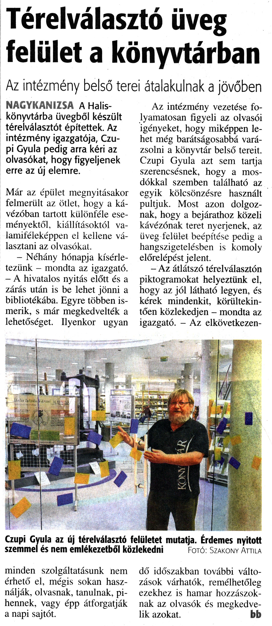Nyilvános 4801 | 3355 | Zalai Hírlap 2018. február 13. 37. szám 3. oldal | Térelválasztó üveg felület a könyvtárban Az intézmény belső terei átalakulnak a jövőben Czupi Gyula az új térelválasztó felületet mutatja. Érdemes nyitott szemmel és nem emlékezetből közlekedni Fotó: Szakony Attila NAGYKANIZSA A Halis-könyvtárba üvegből készült térelválasztót építettek. Az intézmény igazgatója, Czupi Gyula pedig arra kéri az olvasókat, hogy figyeljenek erre az új elemre. Már az épület megnyitásakor felmerült az ötlet, hogy a kávézóban tartott különféle eseményektől, kiállításoktól valamiféleképpen el kellene választani az olvasókat. - Néhány hónapja kísérletezünk - mondta az igazgató. - A hivatalos nyitás előtt és a zárás után is be lehet jönni a bibliotékába. Egyre többen ismerik, s már megkedvelték a lehetőséget. Ilyenkor ugyan minden szolgáltatásunk nem érhető el, mégis sokan használják, olvasnak, tanulnak, pihennek, vagy épp átforgatják a napi sajtót. Az intézmény vezetése folyamatosan figyeli az olvasói igényeket, hogy miképpen lehet még barátságosabbá varázsolni a könyvtár belső tereit. Czupi Gyula azt sem tartja szerencsésnek, hogy a mosdókkal szemben található az egyik kölcsönzésre használt pultjuk. Most azon dolgoznak, hogy a bejárathoz közeli kávézónak teret nyerjenek, az üveg felület beépítése pedig a hangszigetelésben is komoly előrelépést jelent. - Az átlátszó térelválasztón piktogramokat helyeztünk el, hogy az jól látható legyen, és kérek mindenkit, körültekintően közlekedjen - mondta az igazgató. - Az elkövetkezendő időszakban további változások várhatók, remélhetőleg ezekhez is hamar hozzászoknak az olvasók és megkedvelik azokat. bb |