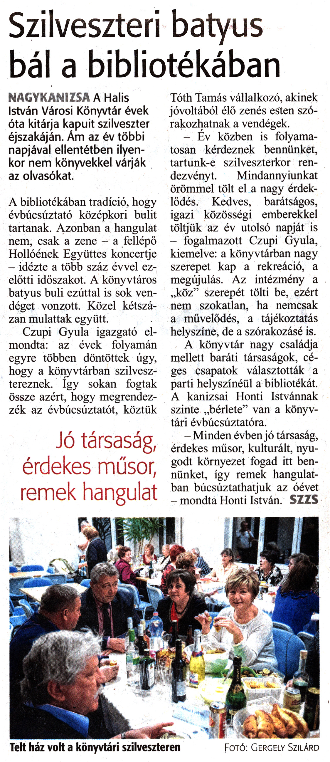 Nyilvános 1865 | 5122 | Zalai Hírlap 2020. január 2. 1. szám 4. oldal | Szilveszteri bátyus bál a bibliotékában NAGYKANIZSA A Halis István Városi Könyvtár évek óta kitárja kapuit szilveszter éjszakáján. Ám az év többi napjával ellentétben ilyenkor nem könyvekkel várják az olvasókat. A bibliotékában tradíció, hogy évbúcsúztató középkori bulit tartanak. Azonban a hangulat nem, csak a zene - a fellépő Hollóének Együttes koncertje - idézte a több száz évvel ezelőtti időszakot. A könyvtáros bátyus buli ezúttal is sok vendéget vonzott. Közel kétszázan mulattak együtt. Czupi Gyula igazgató elmondta: az évek folyamán egyre többen döntöttek úgy, hogy a könyvtárban szilvesztereznek. így sokan fogtak össze azért, hogy megrendezzék az évbúcsúztatót, köztük Tóth Tamás vállalkozó, akinek jóvoltából élő zenés esten szórakozhatnak a vendégek. - Év közben is folyamatosan kérdeznek bennünket, tartunk-e szilveszterkor rendezvényt. Mindannyiunkat örömmel tölt el a nagy érdeklődés. Kedves, barátságos, igazi közösségi emberekkel töltjük az év utolsó napját is - fogalmazott Czupi Gyula, kiemelve: a könyvtárban nagy szerepet kap a rekreáció, a megújulás. Az intézmény a „köz" szerepét tölti be, ezért nem szokatlan, ha nemcsak a művelődés, a tájékoztatás helyszíne, de a szórakozásé is. A könyvtár nagy családja mellett baráti társaságok, céges csapatok választották a parti helyszínéül a bibliotékát. A kanizsai Honti Istvánnak szinte „bérlete" van a könyvtári évbúcsúztatóra. - Minden évben jó társaság, érdekes műsor, kulturált, nyugodt környezet fogad itt bennünket, így remek hangulatban búcsúztathatjuk az óévet - mondta Honti István. SZZS Telt ház volt a könyvtári szilveszteren Fotó: Gergely Szilárd |