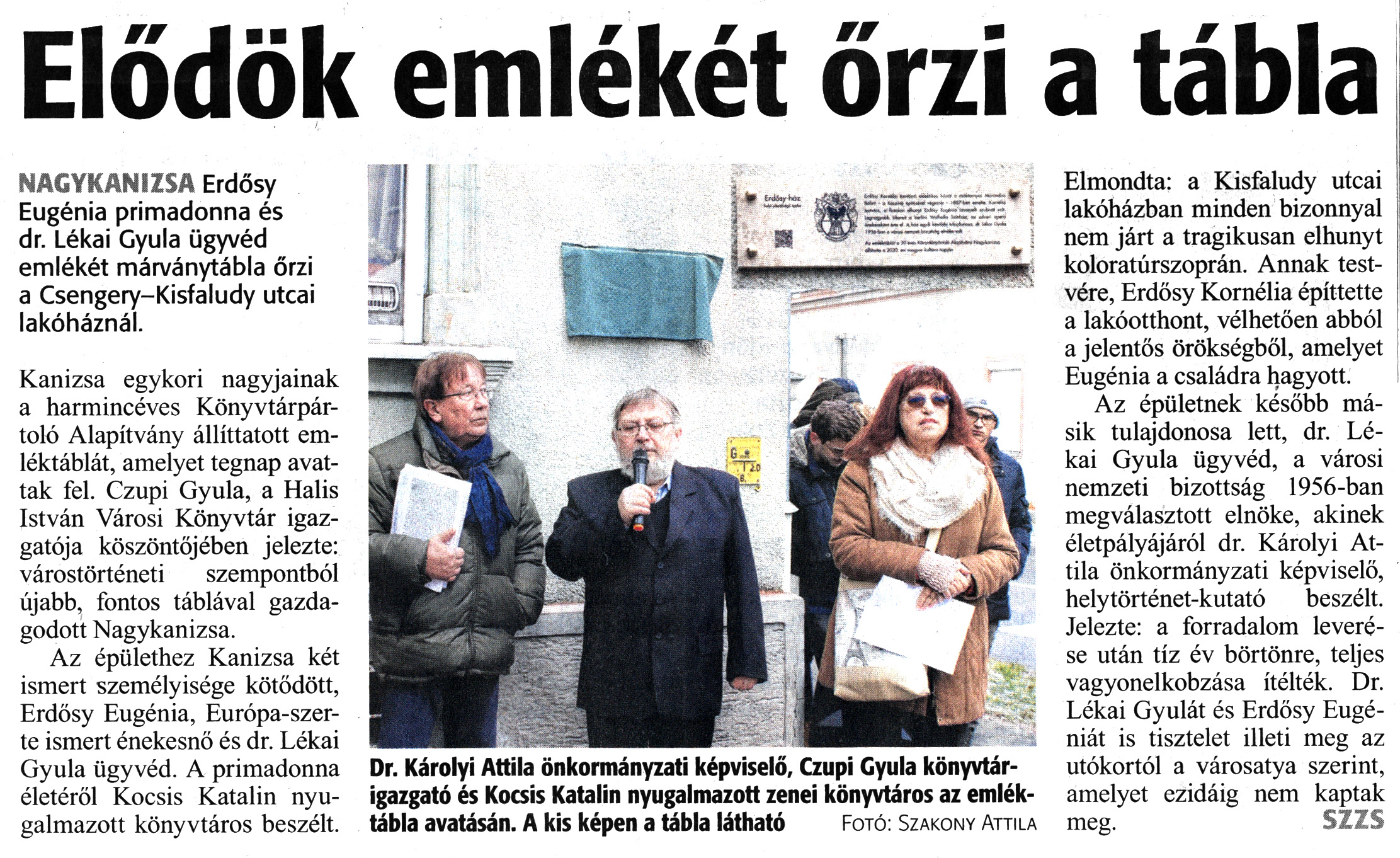 Nyilvános 1802 | 2887 | Zalai Hírlap 2020. január 23. 19. szám 3. oldal | Elődök emlékét őrzi a tábla NAGYKANIZSA Erdősy Eugénia primadonna és dr. Lékai Gyula ügyvéd emlékét márványtábla őrzi a Csengery-Kisfaludy utcai lakóháznál. Kanizsa egykori nagyjainak a harmincéves Könyvtárpártoló Alapítvány állíttatott emléktáblát, amelyet tegnap avattak fel. Czupi Gyula, a Halis István Városi Könyvtár igazgatója köszöntőjében jelezte: várostörténeti szempontból újabb, fontos táblával gazdagodott Nagykanizsa. Az épülethez Kanizsa két ismert személyisége kötődött, Erdősy Eugénia, Európa-szerte ismert énekesnő és dr. Lékai Gyula ügyvéd. A primadonna életéről Kocsis Katalin nyugalmazott könyvtáros beszélt. Elmondta: a Kisfaludy utcai lakóházban minden bizonnyal nem járt a tragikusan elhunyt koloratúrszoprán. Annak testvére, Erdősy Kornélia építtette a lakóotthont, vélhetően abból a jelentős örökségből, amelyet Eugénia a családra hagyott. Az épületnek később másik tulajdonosa lett, dr. Lékai Gyula ügyvéd, a városi nemzeti bizottság 1956-ban megválasztott elnöke, akinek életpályájáról dr. Károlyi Attila önkormányzati képviselő, helytörténet-kutató beszélt. Jelezte: a forradalom leverése után tíz év börtönre, teljes vagyonelkobzása ítélték. Dr. Lékai Gyulát és Erdősy Eugéniát is tisztelet illeti meg az utókortól a városatya szerint, amelyet ezidáig nem kaptak meg. SZZS Dr. Károlyi Attila önkormányzati képviselő, Czupi Gyula könyvtárigazgató és Kocsis Katalin nyugalmazott zenei könyvtáros az emléktábla avatásán. A kis képen a tábla látható Fotó: Szakony Attila |
