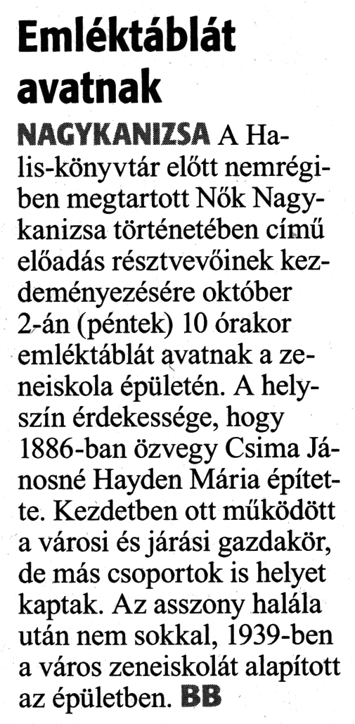 Nyilvános 1780 | 2316 | Zalai Hírlap 2020. szeptember 30. 229. szám 3. oldal | Emléktáblát avatnak NAGYKANIZSA A Halis-könyvtár előtt nemrégiben megtartott Nők Nagykanizsa történetében című előadás résztvevőinek kezdeményezésére október 2-án (péntek) 10 órakor emléktáblát avatnak a zeneiskola épületén. A helyszín érdekessége, hogy 1886-ban özvegy Csima Jánosné Hayden Mária építette. Kezdetben ott működött a városi és járási gazdakör, de más csoportok is helyet kaptak. Az asszony halála után nem sokkal, 1939-ben a város zeneiskolát alapított az épületben. BB |