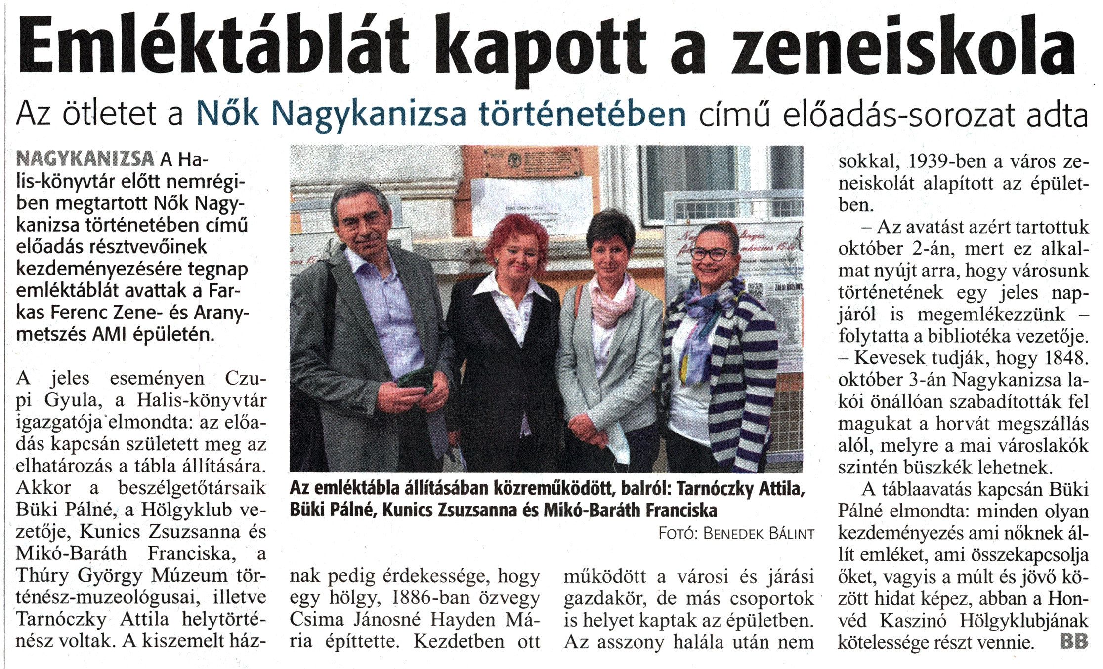 Nyilvános 1610 | 2052 | Zalai Hírlap 2020. október 3. 232. szám 4. oldal | Emléktáblát kapott a zeneiskola Az ötletet a Nők Nagykanizsa történetében című előadás-sorozat adta Az emléktábla állításában közreműködött, balról: Tarnóczky Attila, Büki Pálné, Kunics Zsuzsanna és Mikó-Baráth Franciska Fotó: Benedek Bálint NAGYKANIZSA A Halis-könyvtár előtt nemrégiben megtartott Nők Nagykanizsa történetében című előadás résztvevőinek kezdeményezésére tegnap emléktáblát avattak a Farkas Ferenc Zene- és Aranymetszés AMI épületén. A jeles eseményen Czupi Gyula, a Halis-könyvtár igazgatója elmondta: az előadás kapcsán született meg az elhatározás a tábla állítására. Akkor a beszélgetőtársaik Büki Pálné, a Hölgyklub vezetője, Kunics Zsuzsanna és Mikó-Baráth Franciska, a Thúry György Múzeum történész-muzeológusai, illetve Tarnóczky Attila helytörténész voltak. A kiszemelt háznak pedig érdekessége, hogy egy hölgy, 1886-ban özvegy Csima Jánosné Hayden Mária építtette. Kezdetben ott működött a városi és járási gazdakör, de más csoportok is helyet kaptak az épületben. Az asszony halála után nem sokkal, 1939-ben a város zeneiskolát alapított az épületben. - Az avatást azért tartottuk október 2-án, mert ez alkalmat nyújt arra, hogy városunk történetének egy jeles napjáról is megemlékezzünk -folytatta a bibliotéka vezetője. - Kevesek tudják, hogy 1848. október 3-án Nagykanizsa lakói önállóan szabadították fel magukat a horvát megszállás alól, melyre a mai városlakók szintén büszkék lehetnek. A táblaavatás kapcsán Büki Pálné elmondta: minden olyan kezdeményezés ami nőknek állít emléket, ami összekapcsolja őket, vagyis a múlt és jövő között hidat képez, abban a Honvéd Kaszinó Hölgyklubjának kötelessége részt vennie. BB |