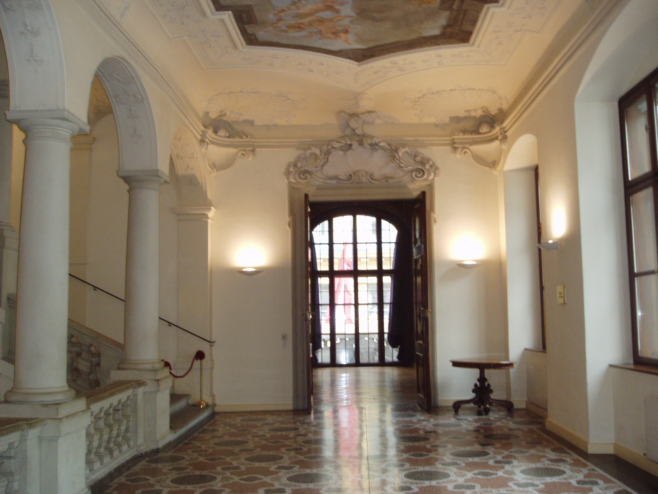 Nyilvános 1712 | 3830 | Augustinerstrasse 2. Lobkowicz-palota | Eredetileg a Dietrichstein grófok számára épült 1685-87 között barokk stílusban, az olasz Giovanni Pietro Tencala építőmester tervei szerint. A Lobkowitz hercegek kívánságára a főhomlokzatot Johann Bernard Fischer von Erlach alakította át 1709-11 között. A palota dísztermét Eroica-teremnek is nevezik, mert 1805. január 3-án Beethoven itt mutatta be III. (Eroica) szimfóniáját. E palotához fűződik az az anekdota, hogy – ugyancsak 1805-ben – Fidelio című operája első változata körüli vitában Beethoven feldühödve hagyta ott a tiszteletére összegyűlt főúri társaságot, s még visszakiabált az utcáról: „Lobkowitz szamár!” Ám a kapcsolatnak ez a dühkitörés nem vetett véget, a zenekedvelő, saját szimfonikus zenekarral rendelkező herceg továbbra is Beethoven mecénása maradt. 1807-ben ugyanitt rendezték meg Beethoven IV. szimfóniájának az ősbemutatóját is. A képen az Eroica-terem bejárata előtti előcsarnok látható, a szemben levő ajtó vezet a terembe (a freskókkal ékesített zeneteremben nem lehet fényképezni). Ebben a palotában tekinthető meg az Osztrák Színháztörténeti Múzeum gyűjteménye is. |
