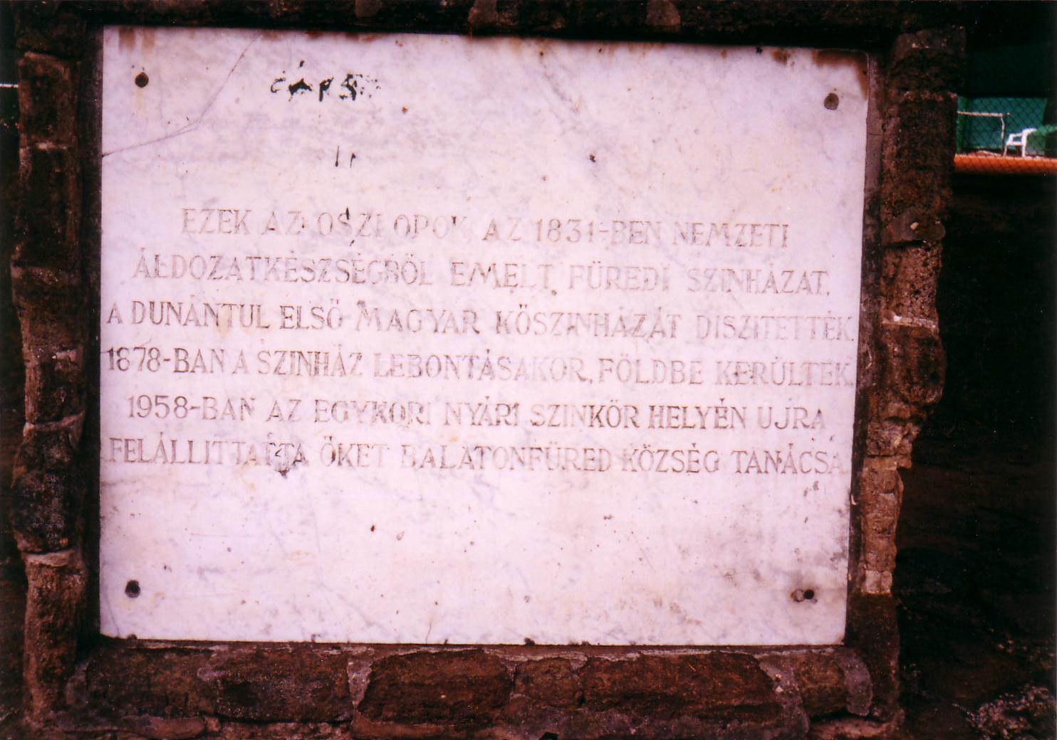 Nyilvános 1457 | 3992 | Balatonfüred, Kiserdő | A Fenyvespark néven is ismert terület Balatonfüred központjában, a Gyógy tér mögött terül el. Az 1800-as évek közepétől az első világháborúig egymást követően két nyári színkör is működött itt. Bár Fürednek 1831-től volt állandó kőszínháza, az épület azonban nagyon levegőtlen volt, ezért nyári játszóhelyet is létesítettek. A legtöbbet Latabár Endre és Molnár György társulatai szerepeltek itt. 1958 őszén a Kiserdő egy emelkedésén, a teniszpályák szélén kialakított félkör alakú helyen, az egykor itt állt két egymást követő nyári színkör közvetlen közelében állították fel a reformkorban létesített füredi kőszínház megmaradt, annakidején Festetics László által adományozott oszlopait. A hat oszlop tetejét pergolaszerűen képezték ki, s a harmadik és negyedik oszlop között emléktáblát helyeztek el. A fénykép 2000 júliusában készült. Felh. irod.: Lipták Gábor – Zákonyi Ferenc: Balatonfüred. Veszprém, 1956 Bándi László: Emlékhelyek Veszprém megyében. Veszprém, 1996 |
