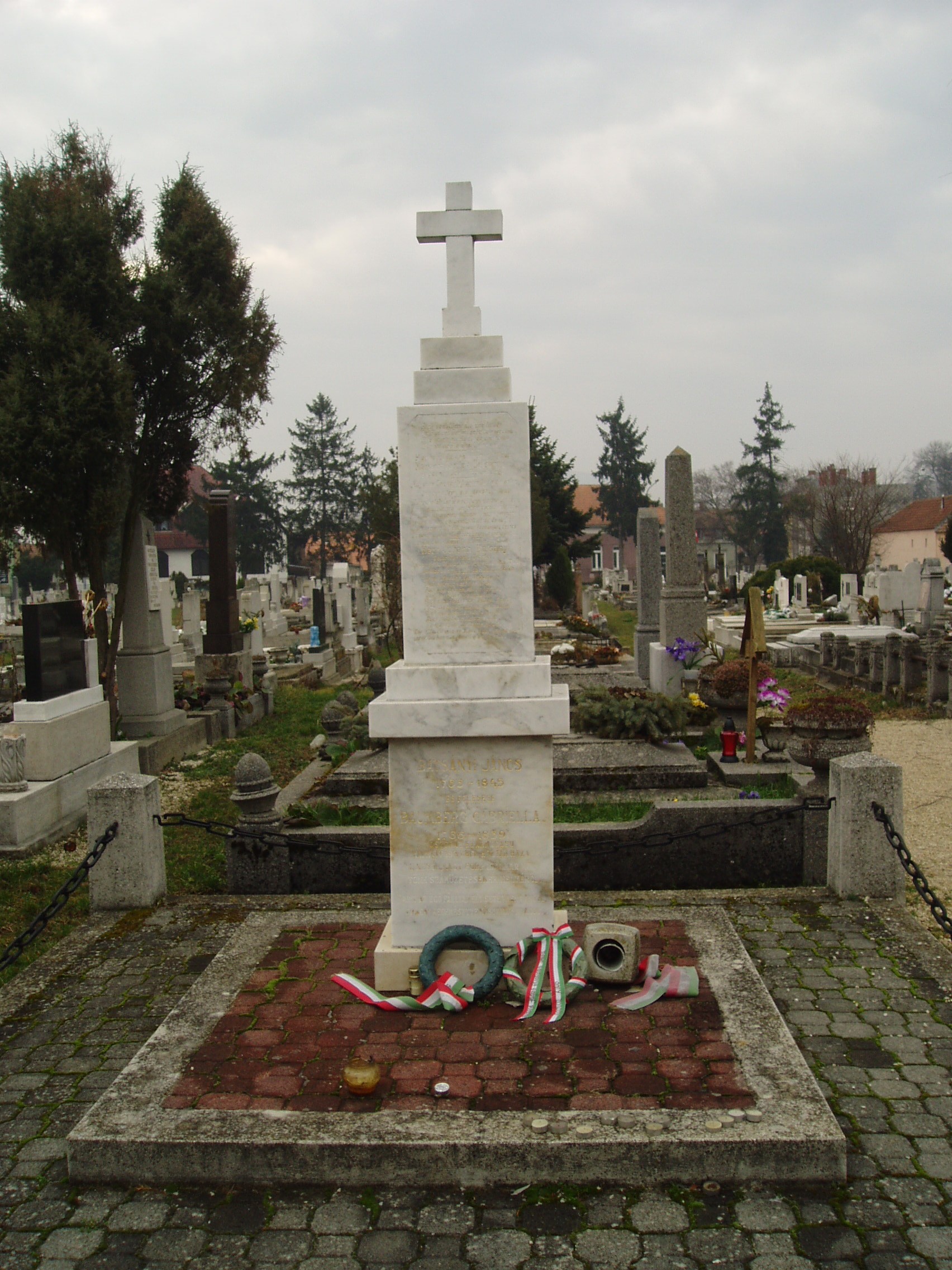 Nyilvános 1143 | 1884 | Tapolca, Régi köztemető: Batsányi János és Baumberg Gabriella sírja | A városközpontból Keszthely felé tartva a Dózsa György út és a Keszthelyi út veszi közre Tapolca régi temetőjét. A kápolnától balra helyezték örök nyugalomra 1934-ben a Linzben 1845-ben elhunyt Batsányi János és felesége hamvait. Eredeti sírkövük, amelyet még Batsányi állíttatott Linzben felesége halála után, 1990-ig állt itteni sírjukon. Romló állapota miatt azóta átvitték a városi múzeumba (lásd: Tapolca, Templom domb 8.), s az eredeti mintájára új sírkövet faragtak. A felvétel 2007 februárjában készült. Felh. irod.: Látnivalók Veszprém megyében. Miskolc, Well-PRess, 2000 Hangodi László: Múltbanéző - kiállításvezető a Tapolcai Városi Múzeum tárlataihoz. Tapolca, 2006 |