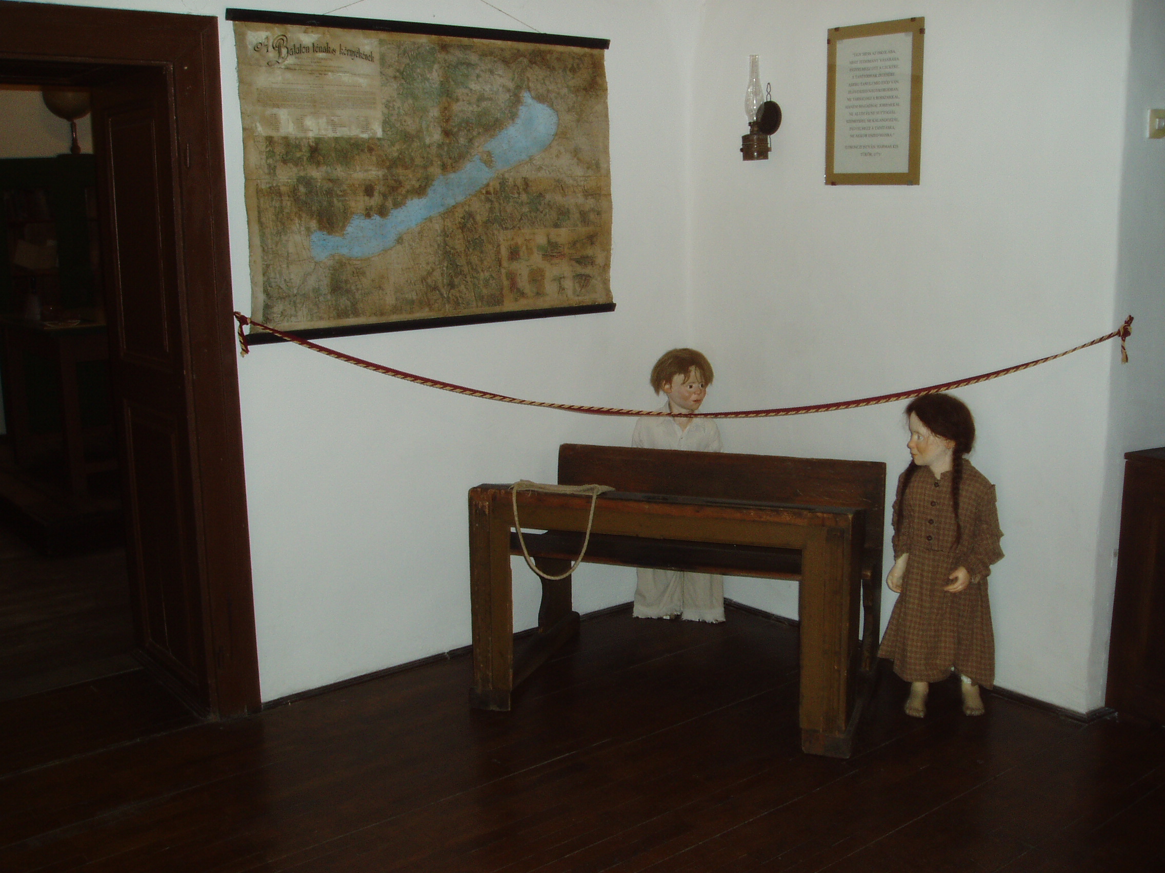 Nyilvános 1154 | 1857 | Tapolca: Templom domb 8. Múzeum | A múzeum épülete, az ún. Kántorház - a város védett építészeti emléke - Tapolca történelmi városközpontjában, a Malom-tó fölötti Templom dombon található. Ide járt elemi iskolába a város nagy szülötte, Batsányi János költő. Az épületben 1733-tól 1884-ig folyt az elemi iskolai oktatás. A múzeum iskolatörténeti kiállításának első helyisége a XIX-XX. század fordulóját idéző zsibongó. A falakon ruhafogas, azon a hajdani kisdiákokat idéző tarisznyák, a sarokban kézmosó lavór, átellenben pedig maguk a régi idők szegényes külsejű iskolásait megelevenítő két életnagyságú bábu barátságos figurája. Az 1902-ből származó Balaton-térkép Lóczy Lajos munkáját dícséri. A felvétel 2007 februárjában készült. Felh. irod.: Látnivalók Veszprém megyében. Miskolc, Well-PRess, 2000 Hangodi László: Múltbanéző - kiállításvezető a Tapolcai Városi Múzeum tárlataihoz. Tapolca, 2006 |