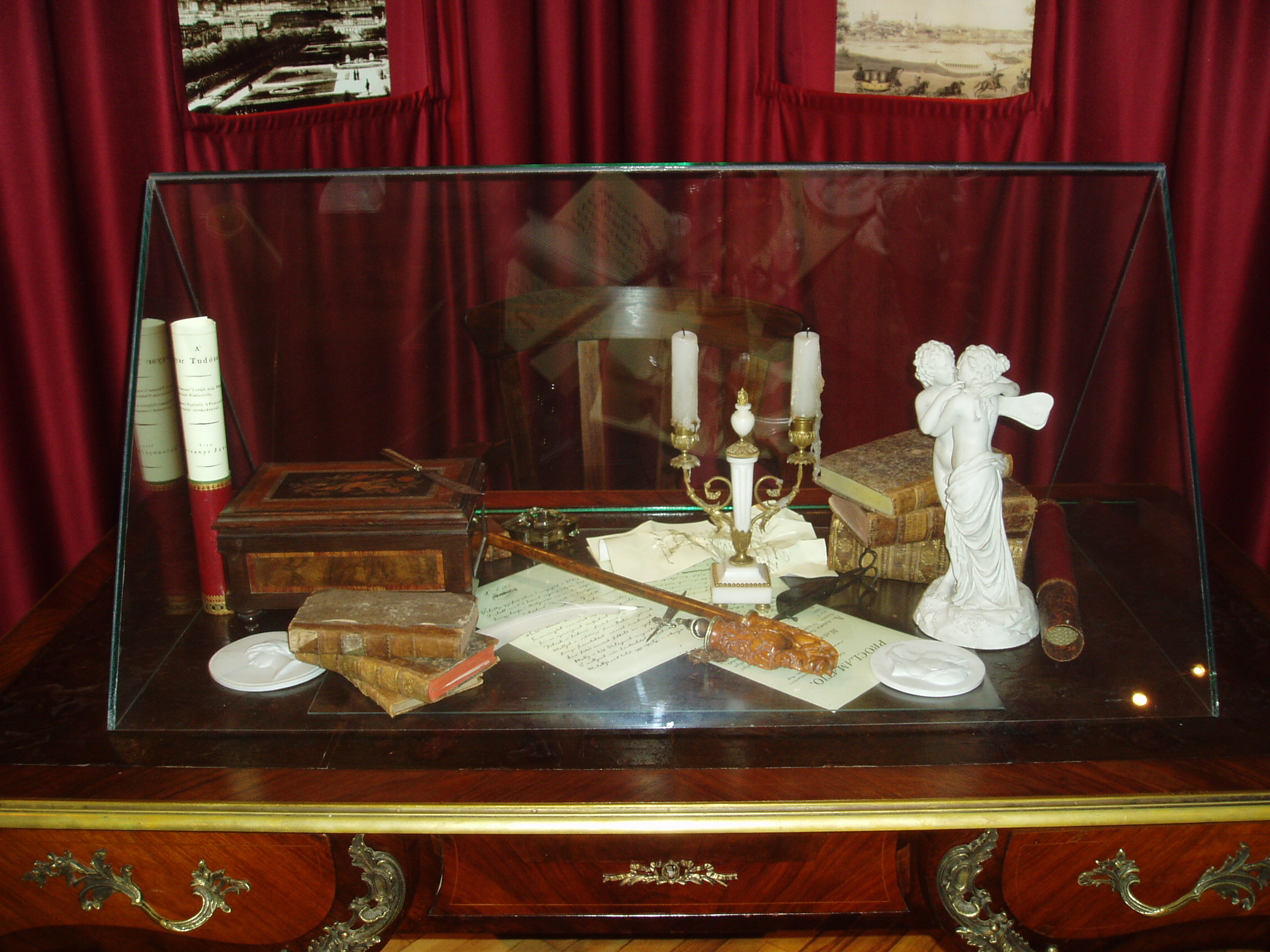 Nyilvános 1153 | 1835 | Tapolca: Templom domb 8. Múzeum | A múzeum épülete, az ún. Kántorház - a város védett építészeti emléke - Tapolca történelmi városközpontjában, a Malom-tó fölötti Templom dombon található. Ide járt elemi iskolába az 1770-es évek elején város nagy szülötte, Batsányi János költő. Részlet a Batsányi Emlékkiállításról: dolgozószoba-sarok. Az itt kiállított tárgyak konkrétan nem kötődnek Batsányihoz, csak korabeliek, illetve életének és pályájának főbb jellemzőit jelenítik meg. A Napóleon-plakett bonapartista irányultságát szimbolizálja. Ámor és Psyché szobra pedig feleségével,a bécsi származású költőnővel, Baumberg Gabriellával megélt és leélt múlhatatlan szerelem kifejezőjeként emlékeztet kettőjük kapcsolatára. A felvétel 2007 februárjában készült. Felh. irod.: Látnivalók Veszprém megyében. Miskolc, Well-PRess, 2000 Hangodi László: Múltbanéző - kiállításvezető a Tapolcai Városi Múzeum tárlataihoz. Tapolca, 2006 |