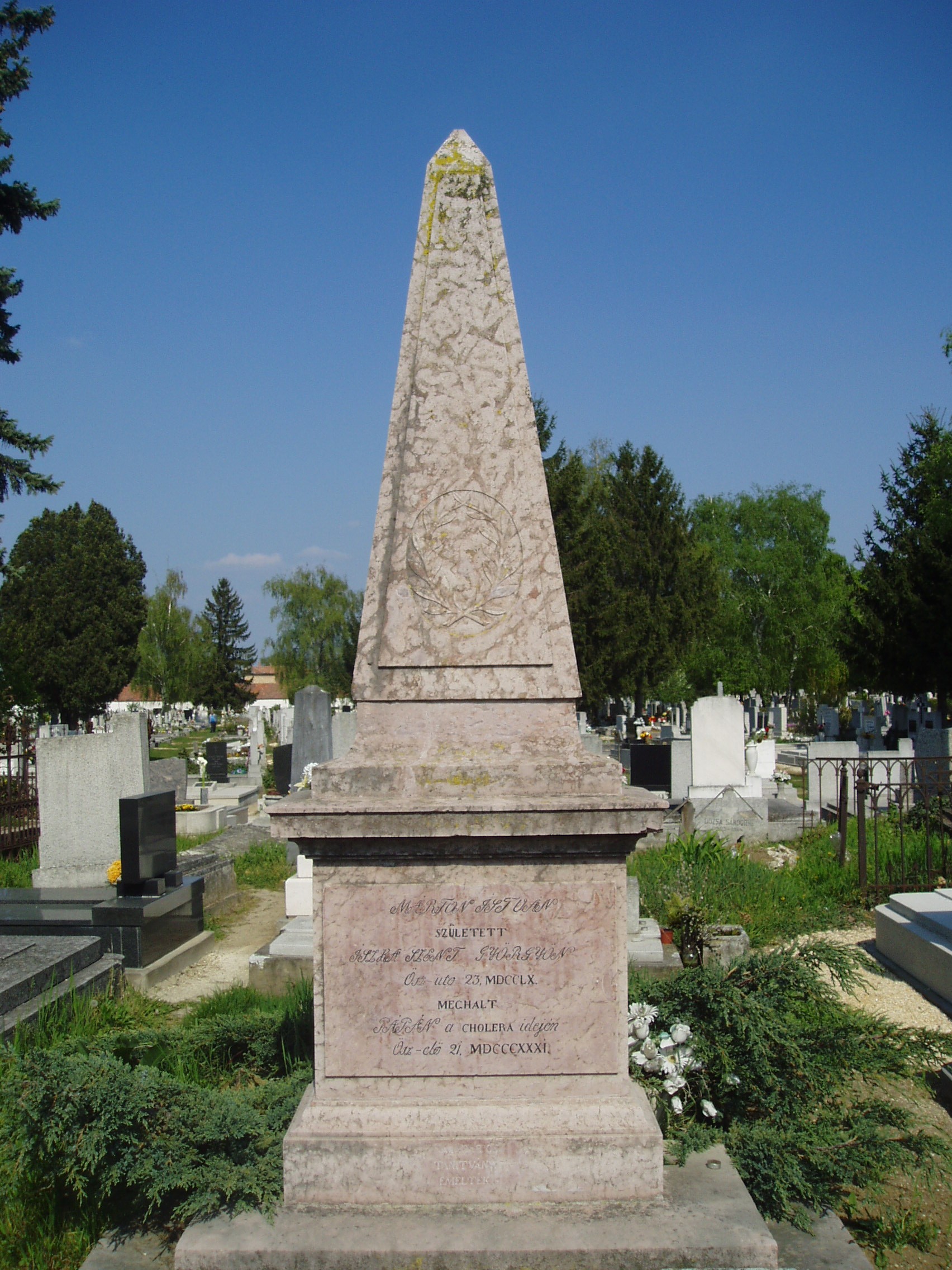 Nyilvános 1387 | 3956 | Rövid leírás | Teljes leírás (1.13 KB) | Pápa, Alsóvárosi temető: Mándi Márton István sírja A Jókai utcáról nyíló Temető utca vezet a XIX. század elején megnyílt Alsóvárosi köztemetőbe. A város sok neves személyiségének van itt a sírja. Itt nyugszik Mándi Márton (Iszkaszentgyörgy, 1760. nov. 23. – Pápa, 1831. szept. 21.) nyelvész, tanár, filozófus. Kecskeméten, Debrecenben, majd Göttingában tanult. 1790-től volt a pápai református gimnázium rektor-professzora. Nevéhez fűződik az iskola új fellendülése. A filozófiában Kant követője volt és 1795-ben már Kant tanítása alapján tartott előadásokat, amelyekért súlyos bírálat érte. Márvány mellszobra, Izsó Miklós alkotása a református könyvtárban látható (Pápa, Március 15. tér 9.). A városban utcanév, az Ókollégium (Petőfi S. utca 13.) falán tábla őrzi emlékét. A fénykép 2007 áprilisában készült. Felh. irod.: Németh Adél - Szabó Lajos: Pápa. Bp. Panoráma, 1989 Veszprém megyei életrajzi lexikon. Veszprém, Veszprém Megyei Önkormányzat Közgyűlése, 1998 |