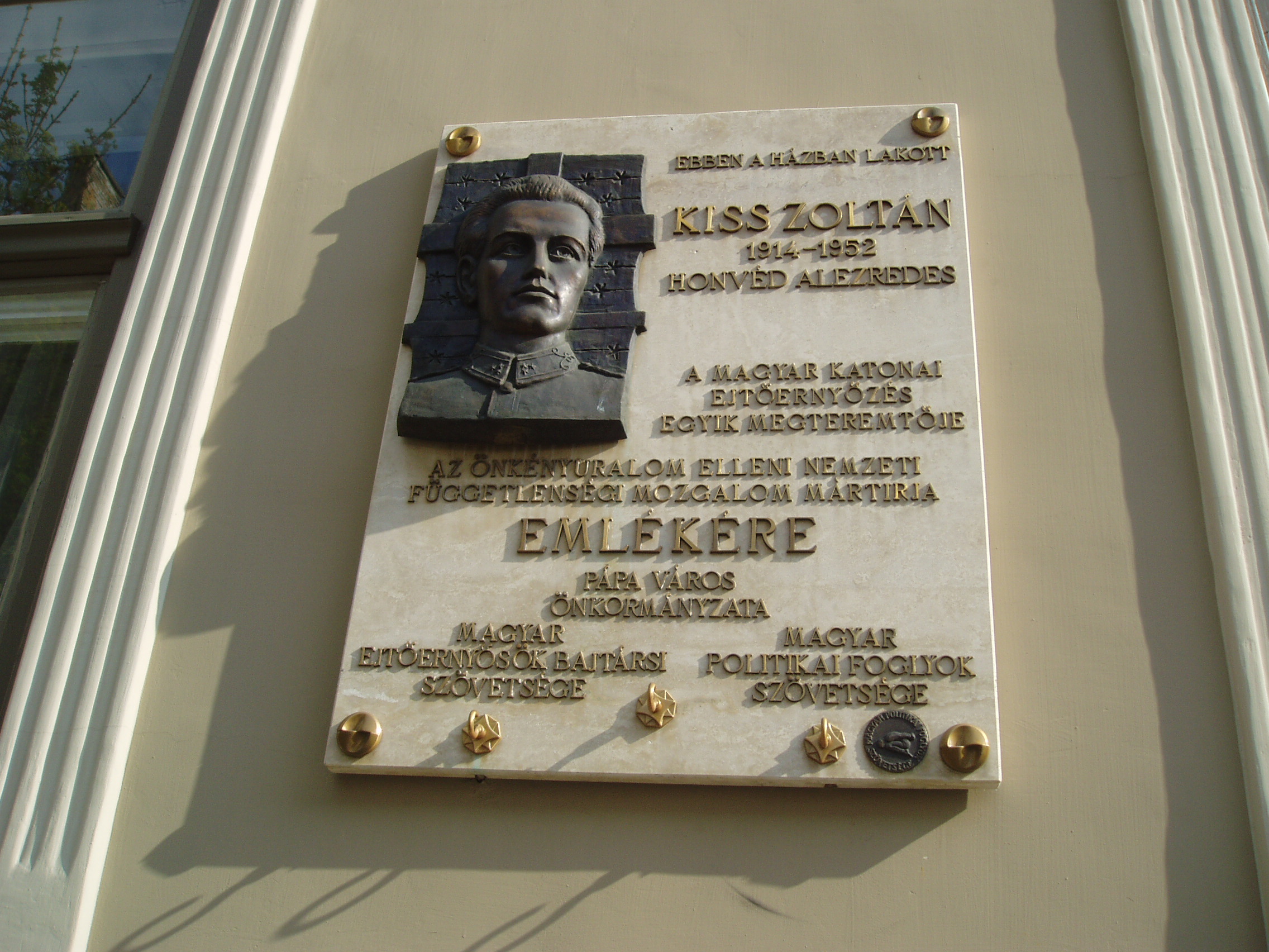 Nyilvános 1159 | 1955 | Pápa, Deák Ferenc utca 2. | Ebben a házban lakott Kiss Zoltán (Fadd, 1914. jan. 18. – Bp., 1952. ápr. 11.), a magyar katonai ejtőernyőzés egyik megteremtője. 1938-ban fiatal hadnagyként került a Bertalan Árpád által szervezett ejtőernyős kísérleti keretbe és azzal együtt Pápára. 1941-ben, Bertalan halála után az egység parancsnokává nevezték ki. 1944-ben ezredesként vett részt a második világháborúban. 1945 után a repülőakadémia ejtőernyős kiképzője volt, de 1951-ben letartóztatták, 1952-ben koholt vádak alapján halálra ítélték és kivégezték. A fénykép 2007 áprilisában készült. Felh. irod.: Veszprém megyei életrajzi lexikon. Veszprém, Veszprém Megyei Önkormányzat Közgyűlése, 1998 Veszprém megyei életrajzi lexikon. Veszprém, Veszprém Megyei Önkormányzat Közgyűlése, 1998 |