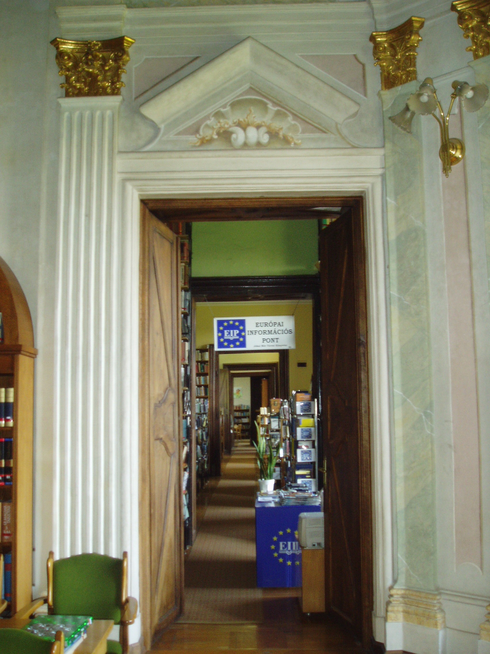 Nyilvános 1122 | 1966 | Pápa, Fő tér 1-3. Esterházy-kastély | A barokk kastély a korábban itt állott végvár helyére épült, részben annak alapfalai, kövei felhasználásával. A régi várat az 1740-es évektől Esterházy Ferenc (1683–1754) tárnokmester kezdte átalakítani Franz Anton Pilgram tervei alapján. A barokk várkastély kialakítása 1784-re fejeződött be Esterházy Ferenc fia, Eszterházy Károly egri püspök idejében Fellner Jakab, majd Grossmann József vezetésével. Az U alakú, egyemeletes épület a versailles-i palota nyomán elterjedt francia kastélytípus képviselője. Az épület keleti szárnyának emeletén volt a kastély kápolnája. Az 1988/89-ben végzett restaurálás eredményeképpen ma újra megcsodálható a helyiség eredeti architektúrája és Joseph Ignaz Mildorfer 1750 körül festett mennyezetképe, amely Krisztus mennybemenetelét ábrázolja. A kápolnában, amelynek példaszerű felújításáért a város 1990-ben Europa Nostra díjat kapott, ma a Jókai Mór Városi Könyvtár olvasóterme működik. A fénykép 2007 áprilisában készült. Felh. irod.: Németh Adél - Szabó Lajos: Pápa. Bp. Panoráma, 1989 Pápa. Szerk. Sz. Farkas Aranka. Bp., Magyar Képek, 2000 |