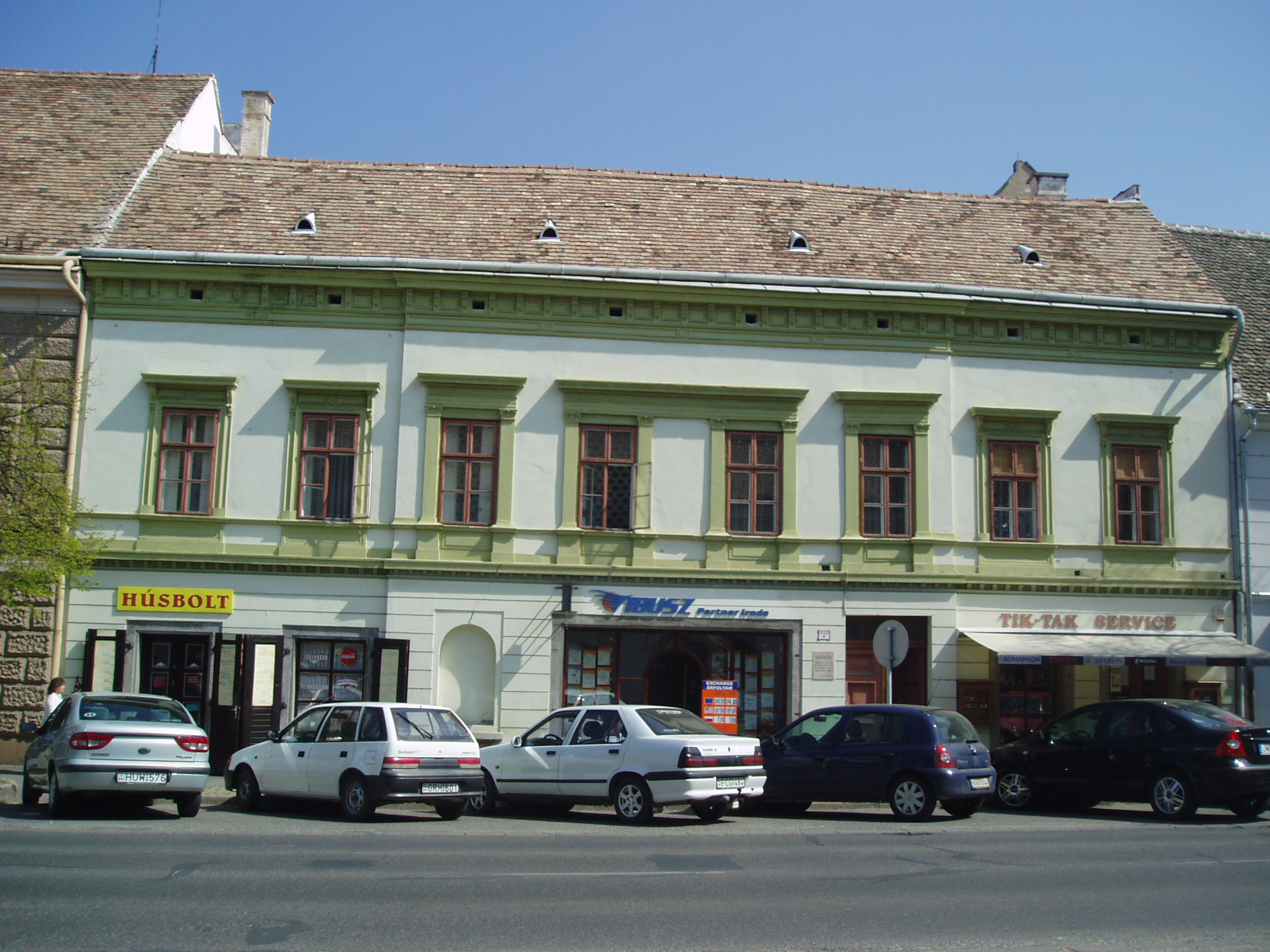 Nyilvános 1133 | 1678 | Pápa, Fő utca 4. | A Baranyay, illetve azt megelőzően Eőry-Szabó-féle ház egyemeletes, U alaprajzú lakóház. 1760 körül épült barokk stílusban. Romantikus arculatát 1850 kürül nyerte el. Rendkívül hangulatos udvara van. Udvarán - és a Fő utca 6. számú ház udvarán - áll a Református Ótemplom, azon a helyen, ahol 1718-1752 között egy fészer szolgált az istentisztelet helyszínéül. Az ótemplom felépítését II. József türelmi rendelete tette lehetővé 1783-ban. A rendeletben előírtak betartásával a templom nem az utca homlokzatvonalában, hanem zárt udvaron és torony nélkül épülhetett csak fel. A templom a késő barokk - kora klasszicista stílusú református templomok legkorábbi képviselője. 1972-ben nyitották meg benne a Református Egyháztörténeti Múzeum kiállítását. Sajnos jelenleg (2007. április) sem az épület, sem a kiállítás nem látogatható "takarékossági okok" miatt (fényképet sem tudtam róla készíteni, csak az utcafrontról: K. K.). A fénykép 2007 áprilisában készült. Felh. irod.: Németh Adél - Szabó Lajos: Pápa. Bp. Panoráma, 1989 |