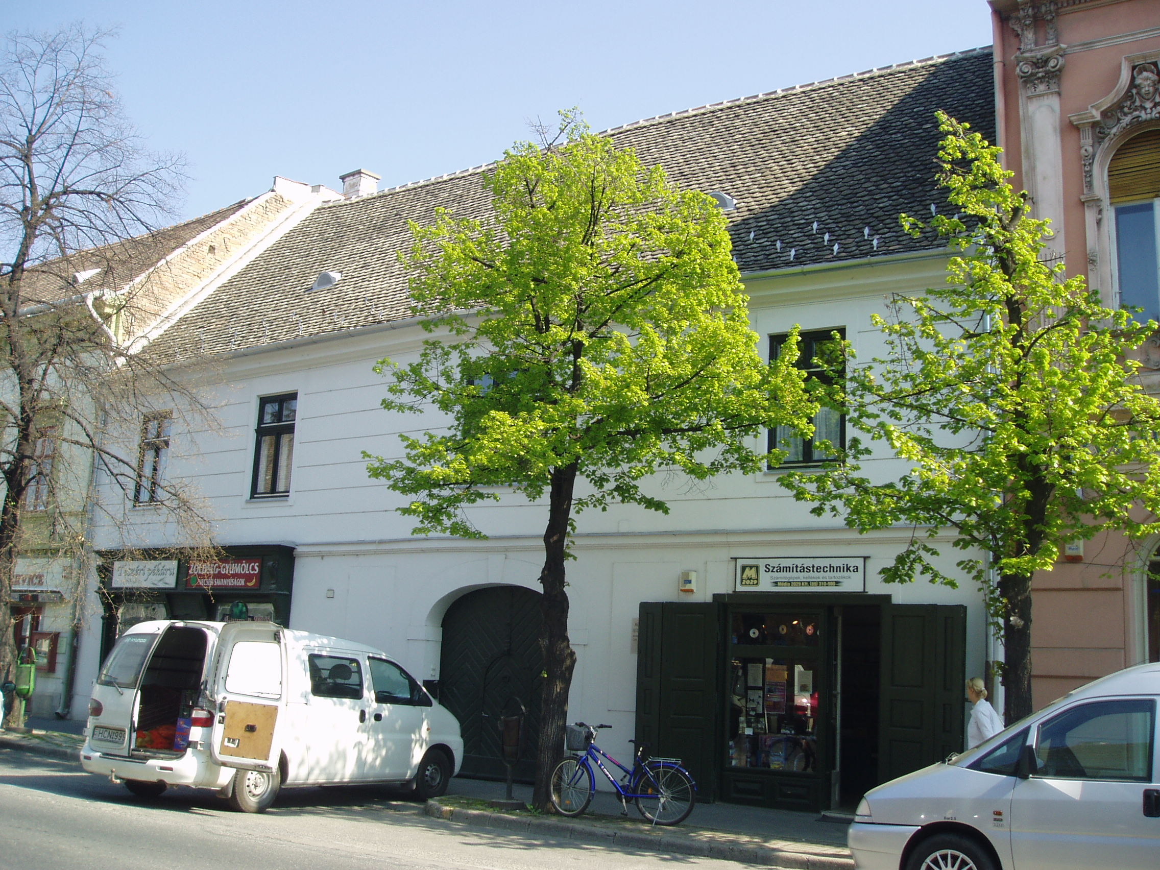 Nyilvános 1132 | 1815 | Pápa, Fő utca 6. Református lelkészlak | A református lelkészlak egyszerű, egyemeletes épület,. 1750 körül emelték barokk stílusban; sajnos, az átépítések következtében nagyrészt elvesztette eredeti arculatát. Udvarán - és a Fő utca 4. számú ház udvarán - áll a Református Ótemplom, azon a helyen, ahol 1718-1752 között egy fészer szolgált az istentisztelet helyszínéül. Az ótemplom felépítését II. József türelmi rendelete tette lehetővé 1783-ban. A rendeletben előírtak betartásával a templom nem az utca homlokzatvonalában, hanem zárt udvaron és torony nélkül épülhetett csak fel. A templom a késő barokk - kora klasszicista stílusú református templomok legkorábbi képviselője. 1972-ben nyitották meg benne a Református Egyháztörténeti Múzeum kiállítását. Sajnos jelenleg (2007. április) sem az épület, sem a kiállítás nem látogatható "takarékossági okok" miatt (fényképet sem tudtam róla készíteni, csak az utcafrontról: K. K.). A fénykép 2007 áprilisában készült. Felh. irod.: Németh Adél - Szabó Lajos: Pápa. Bp. Panoráma, 1989 |