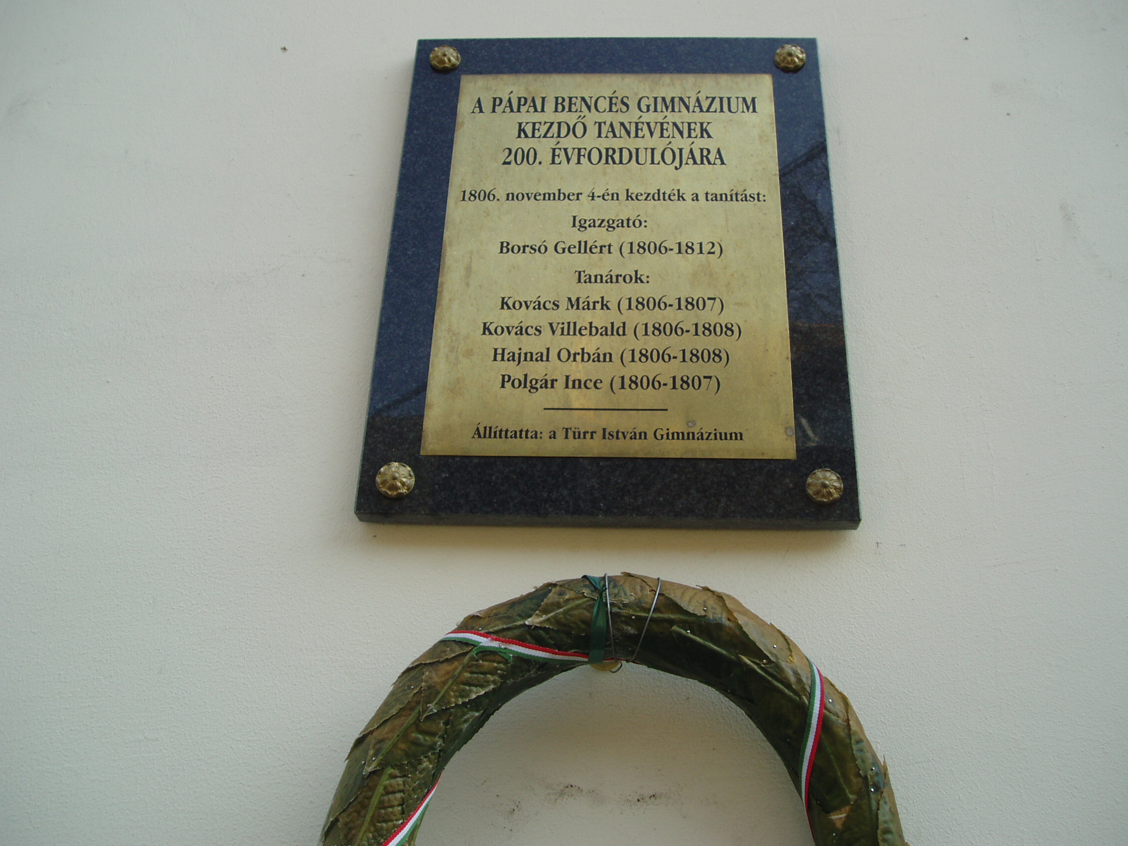 Nyilvános 1129 | 1667 | Pápa, Fő utca 10. Bencés templom | Eredetileg a pálosok számára épült 1737-1742 között a korábban itt állott templom helyére. Építtetője, Acsády Ádám püspök szentelte fel. A pálos rend eltörlése után, 1806-ban kapták meg a bencések, akik ugyanebben az évben átvették és rendkívül magas szintre fejlesztették a pálosok korábbi iskoláját. A képen a bencés gimnázium 200. évfordulója alkalmából elhelyezett emléktábla látható az első tanári kar névsorával. A fénykép 2007 áprilisában készült. Felh. irod.: Németh Adél - Szabó Lajos: Pápa. Bp. Panoráma, 1989 |