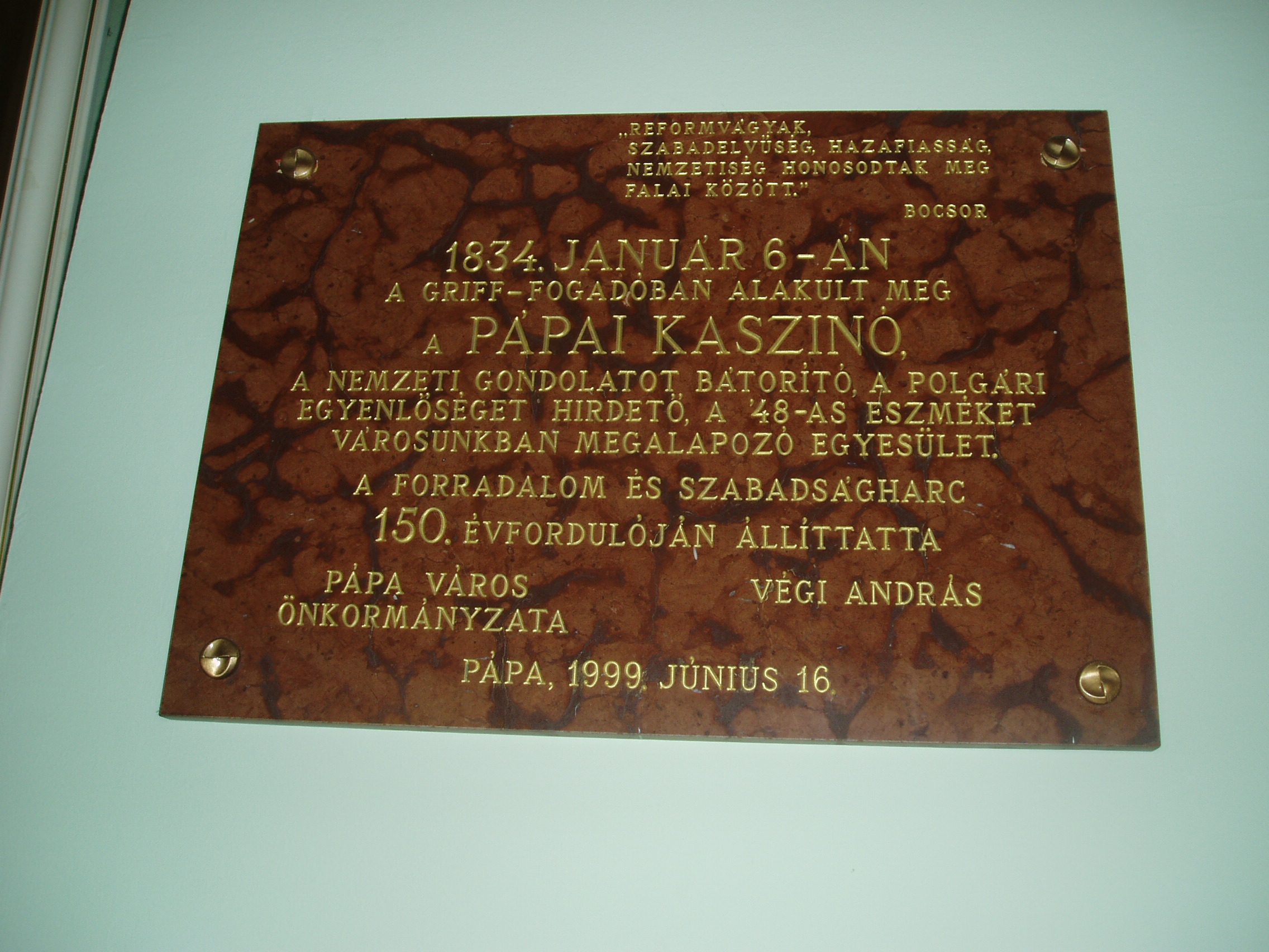 Nyilvános 1160 | 1778 | Pápa, Fő utca 15. Griff Szálló - a Kaszinó megalakulásának emléktáblája | A Fő tér és a Fő utca sarkán áll a Griff Szálló copf stílusú, 1780–1790 között emelt, 1870 körül némileg átalakított épületegyüttese. Nevét az Esterházy család címerállatáról kapta. A Fő utca felőli oldalt Kapuszínnek is nevezik, ugyanis az emelet alatti részen nyílik Pápa sétálóutcájának, a Kossuth utcának a bejárata. A ház másik része a szálloda. A XIX. század folyamán a Griff volt a pápai társas élet központja. Itt alakult meg 1834-ben, Széchenyi István kezdeményezése nyomán — az országban az elsők között — a pápai kaszinó. E jeles eseménynek 1999-ben felavatott vörös márványtábla állít emléket. A Griff ma is meglévő patinás tánctermében — az ún. Tükörteremben — egykor színielőadások és megyebálok zajlottak. Testőrtiszt korában táncolt itt leendő feleségével, Szegedy Rózával Kisfaludy Sándor. Jónéhány évtizeddel később Mikszáth Kálmán volt jelen egy itt tartott táncmulatságon, s ez az élmény inspirálta A Noszty fiú esete Tóth Marival című regényének báli jelenetét. A XIX. század legelejétől 1881-ig, a pápai kőszínház (lásd: Pápa, Március 15. tér) megépítéséig a városba érkező különböző színtársulatok — kevés kivétellel — a Griff nagytermében tartották előadásaikat. A magyar színjátszás nagy egyéniségei közül játszott itt Déryné és Kántorné is. 1842-ben a színielőadások rendszeres látogatója volt két pápai diák, akik maguk is színészi–művészi vágyakat melengettek szívükben: Petőfi Sándor és Jókai Mór (akkor még Petrovics Sándor és Jókay Móric). Petőfi már itt tapsolhatott későbbi jóbarátjának, Egressy Gábornak, aki nevezetes szerepeiben lépett fel a társulat vendégeként — többek között Hamletet és Lear királyt játszotta. A társulat vezető színésznője Szatmáryné Farkas Lujza volt, aki elbűvölte a kamasz Petőfit. Petőfi és Jókai tiszteletüket kívánták tenni a művésznőnél, akit azonban éppen egy társnőjével civakodva találtak a Griff folyosóján. Petőfi — kiábrándulva — ekkor írta meg Szín és való című költeményét, amellyel aztán két arany pályadíjat nyert. A teremben sok jeles hangversenyt is rendeztek. 1937-ben fellépett itt Bartók Béla is fiatal kamarapartnerével, Gertler Endre hegedűművésszel. E nevezetes koncert 60. évfordulóján, 1997-ben emlékhangversenyt rendeztek ugyanitt, melyen részt vett az akkor már 90 esztendős Gertler Endre is. Mindkét eseményről vörös márványtábla emlékezik meg a Tükörteremben. Felh. irod.: Pápa. Szerk. Sz. Farkas Aranka. Bp., Magyar Képek, 2000. Németh Adél – Szabó Lajos: Pápa. Bp. Panoráma, 1989 Nádasdy Lajos: A pápai kőszínház története 1817–1931. Veszprém, 1981, Veszprém megyei Tanács www.kincsestar.radio.hu/harangok "A kényes úrfi s a rongyos baka". Tanulmányok két halhatatlan pápai diákról. Pápa, Pápai Református Gyűjtemények, 2001 |