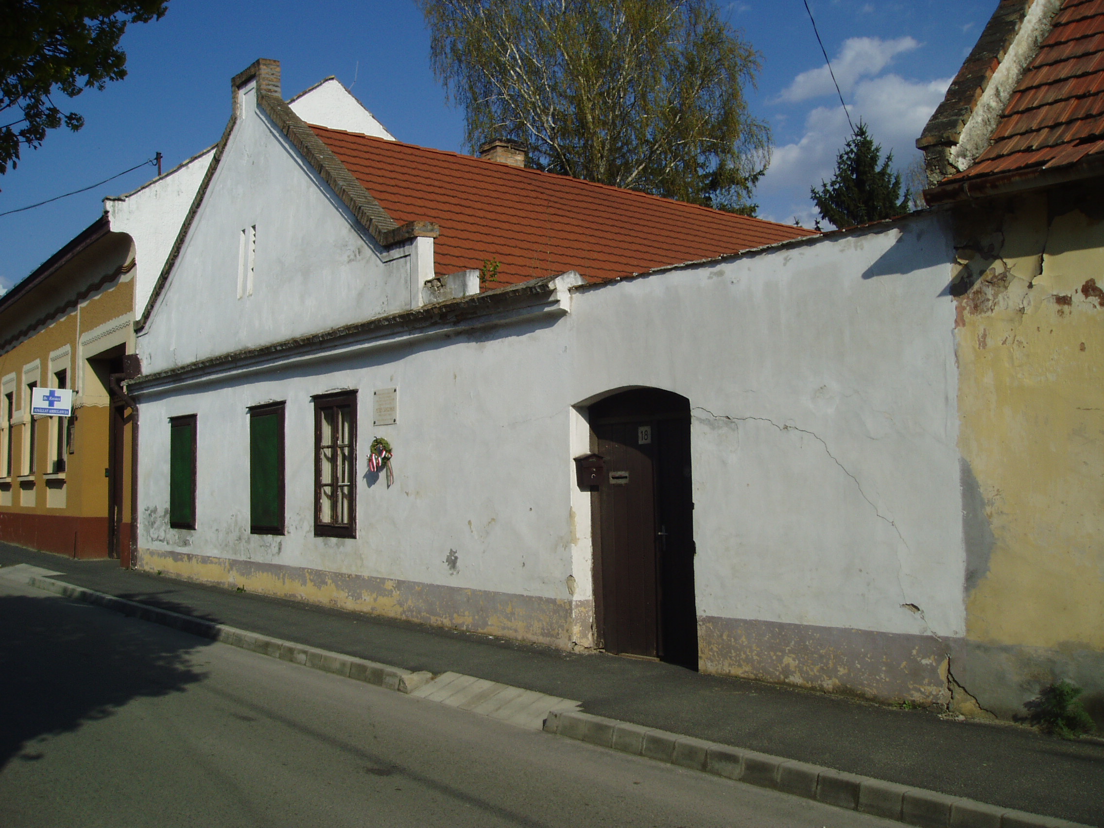 Nyilvános 1149 | 1804 | Pápa, Gyurátz Ferenc utca 18. | Mint a homlokzaton elhelyezett emléktáblán is olvasható, ebben a kis házban lelt először otthonra Pápán Petőfi Sándor 1841 márciusában. Petőfi - akkor még Petrovics - Sándor akkor szerelt le a kis híján katasztrófával végződő katonai szolgálatból, s reménytelen helyzetben volt: iskoláit félbehagyta, apja kitagadta. Ekkor ment Pápára, mert tudta, hogy unokatestvére, Orlai Petrich Soma az ottani kollégiumban tanul. Akkor ebben a kis házban egy Kis Gábor nevű diák is volt koszton-kvártélyon, s mivel Orlai Petrich még nem ért haza az iskolából, a háziasszony őt kérte meg, hogy vigye szobájába Petőfit, aki iránt külseje miatt bizalmatlan volt. Kis Gábor később így emlékezett: "Elképzelhetni, milyen lehetett a sors üldözte, ágról szakadt isten-katonája, az ő megviselt uniformisában. És ne vegye senki rossz néven, ha a rendet annyira kedvelő háziasszony ugy nyilatkozott előttem. Dehogy hitte, de ki is hitte volna, hogy az a katona egykor a Dalaim és Magyarország annyi dalainak szerzője. Bementem Petőfiért, ott ült a háziasszony szobájában egy széken, a 'sárgapitykés, zöldhajtókás közlegény': mellette a padlón ellapulva hevert az üres vászontarisznya, a bot az ágynak támaszkodott görcsös fejével ... Magam bemutatása rövid volt, mit is mondhattam volna sokat, a lábain céhláda nagyságu bakancsokban előttem álló Petőfit vendégemül meghívám, ő vette a botot és a tarisznyát s mentünk ... a mi szobánkba... Hazajött Orlay ... A legelső estét a mi szobánkban töltöttük; ... a barátság melegénél, mert borunk kevés volt, felmelegedett az elcsigázott, vézna alaku költő, csak hamar láng csapott ki homlokán, szavalt idegen költők műveiből, Horác ódáit egymásután mondta könyv nélkül..." Körülbelül három hétig tartózkodott itt Petőfi, amikor elhagyta Pápát, mert édesapjától megbocsátó levelet kapott. A fénykép 2007 áprilisában készült. Felh. irod.: Németh Adél - Szabó Lajos: Pápa. Bp. Panoráma, 1989 Petőfi emlékhelyek a Kérpát-medencében. Kiskőrös, 1996, Petőfi Sándor Társaság "A kényes úrfi s a rongyos baka". Tanulmányok két halhatatlan pápai diákról. Pápa, 2001, Pápai Református Gyűjtemények |