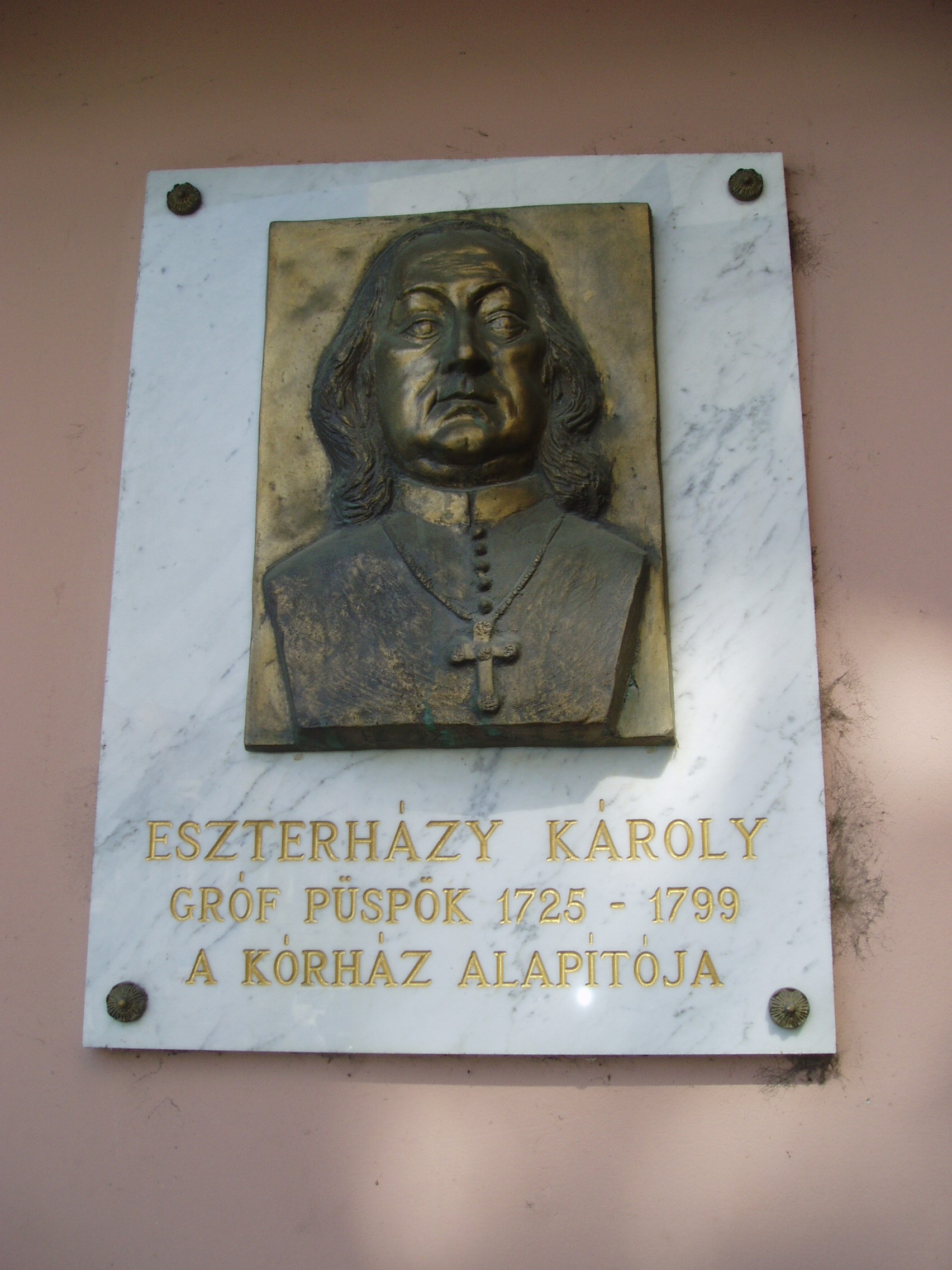 Nyilvános 1202 | 1969 | Pápa, Jókai utca 9. | A kórház közelmúltban átadott új épületén - a régi épület szomszédságában - gróf Eszterházy Károly (1725-1799) portrédomborműves emléktáblája látható. Pápán a kórházi ápolás bevezetése az Esterházy Ferenc által 1730 körül betelepített Irgalmas rend nevéhez fűződik. Pápa városi kórházát 1757-ben alapította Esterházy Károly - akkor váci, majd egri püspök -, Pápa ura. A szomszédos épület (lásd: Pápa, Jókai u. 7.) az ő adományából épült Fellner Jakab vezetésével. A fénykép 2007 áprilisában készült. Felh. irod.: Németh Adél - Szabó Lajos: Pápa. Bp. Panoráma, 1989 Veszprém megyei életrajzi lexikon. Veszprém, Veszprém Megyei Önkormányzat Közgyűlése, 1998 |