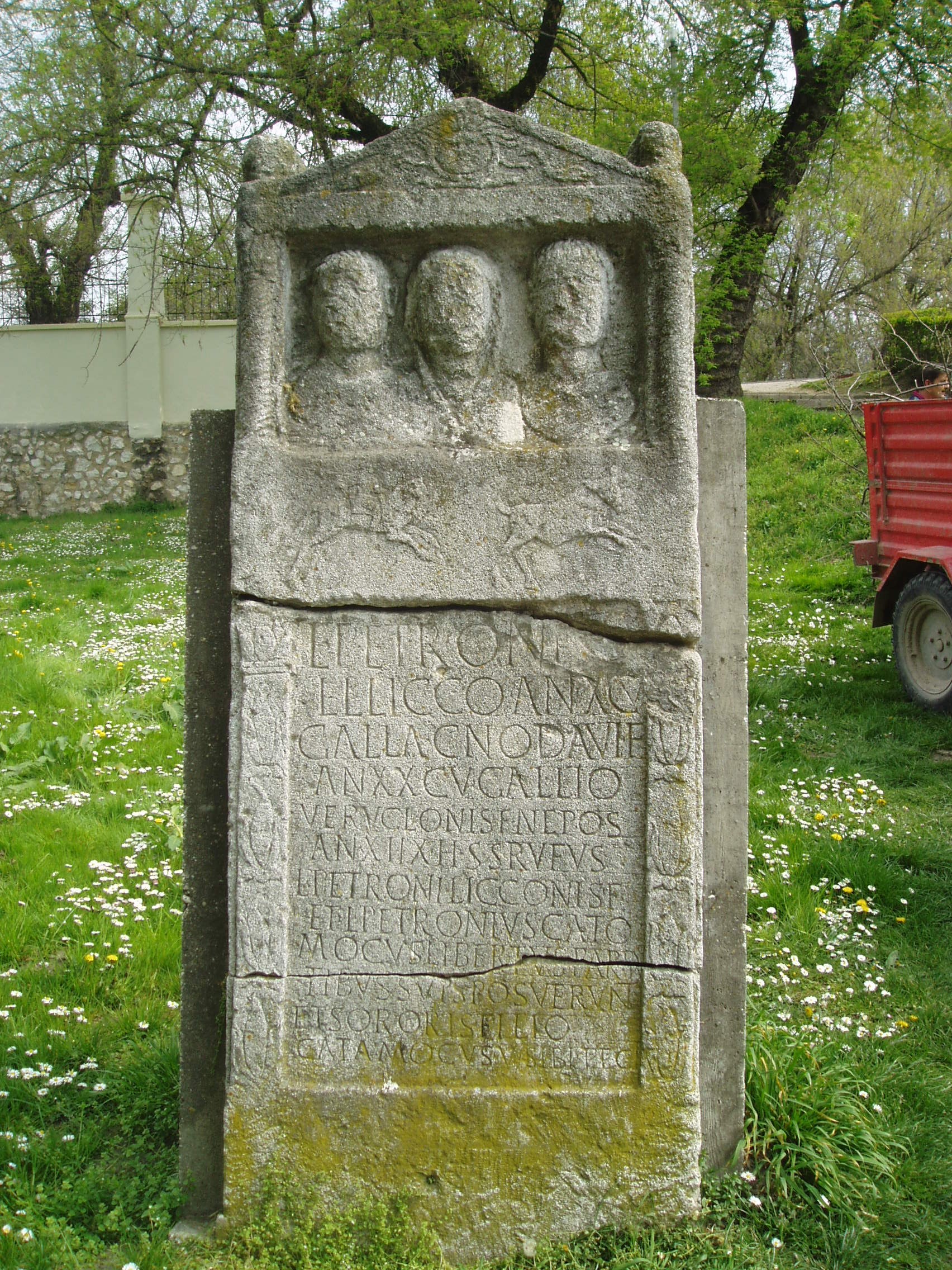 Nyilvános 1186 | 2412 | Pápa, Köztársaság liget 1. | A színház parkjában állították fel a Pápa közelében, Diósdon talált régi római sírkövet. A sírkő egy egykori sírláda fedlapja, mely mészkőből készült. A timpanon díszítésében medúzafő és delfinek láthatók. A három alak ábrája a sírban nyugvó három személyre utal. A sírfelirat szerint a családfő a Petronius nemzetséghez tartozott. Felszabadított rabszolga volt, de jelentős üzleti karriert futott be, s egy kereskedőcég pannóniai képviselője lett. A fénykép 2007 áprilisában készült. Felh. irod.: Jankó László: A kisdiósi Petronius sírkő. = Archaelógiai Értesítő, 1928. 207-210. p. Tóth István: Feliratos római kőemlékek Pápán. = Pápai Múzeumi Értesítő 1995. 160-162. p. Czuppon Elek - Jankó László - Sarudy György: Egy érdekes sírkő Pápán [ ... ]. = Pápai Hírlap, 1927. július 30. - október 15. |