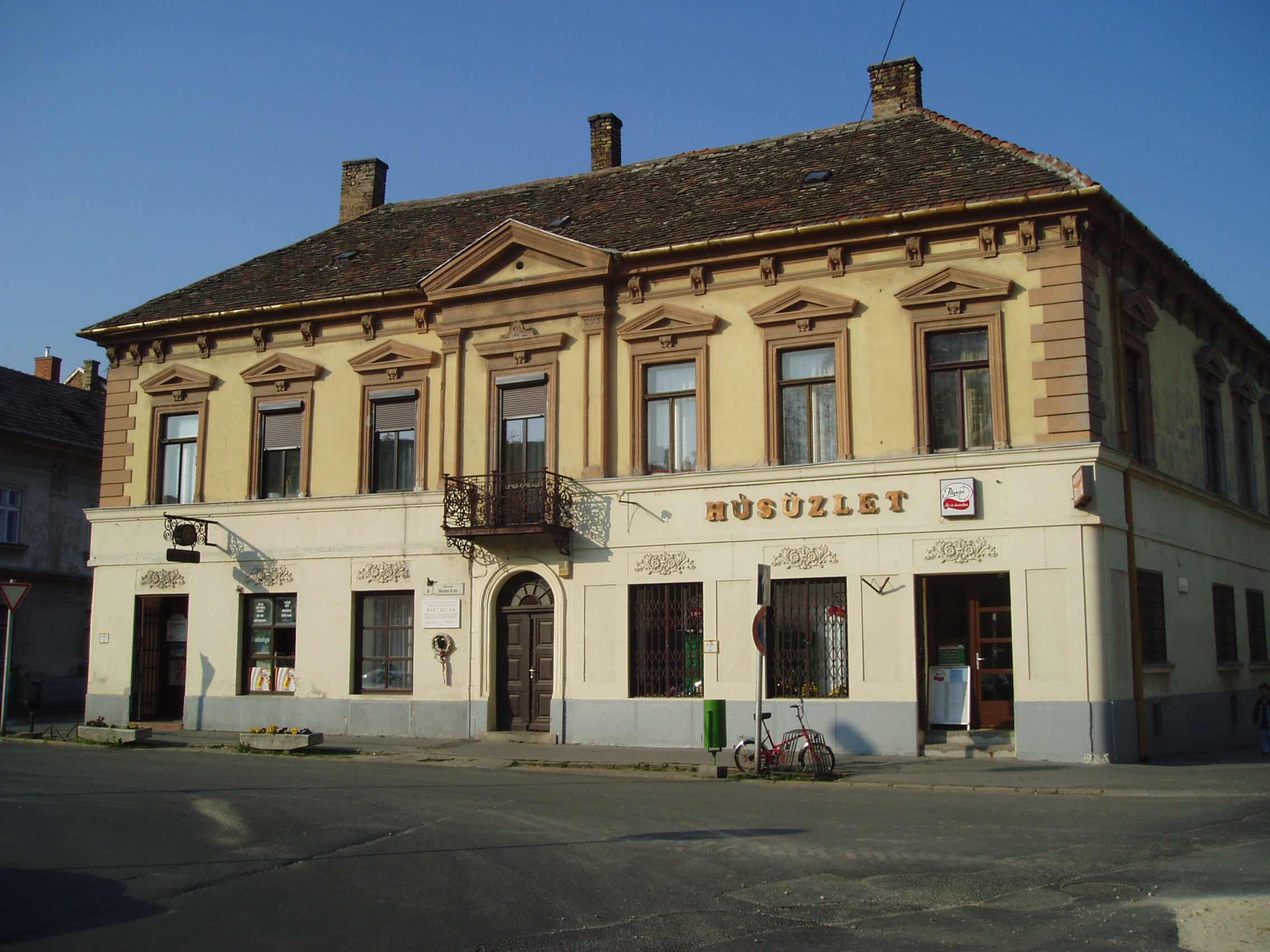 Nyilvános 1131 | 1822 | Pápa, Március 15. tér 8. | Az emeletes saroklakóház 1870 körül épült. Ebben a házban született 1923. július 3-án Rab Zsuzsa költő, műfordító. Édesapja, Rab István 1886-1957) a második világháborút megelőző időszakban a Pápai Református Kollégium Gimnáziumának (lásd: Pápa, Március 15. tér 9.) legendás hírű igazgatója, édesanyja a pápai templomépítő–gondnok, Jilek Ferenc lánya. Tanulmányait szülővárosában kezdte, majd 1944–ben a Kecskeméti Református Nőnevelő Intézetben érettségizett. A budapesti egyetem orvostudományi szakára iratkozott be, majd egy év elteltével a bölcsészkar orosz szakos hallgatója lett. A nyelvek, az irodalmak szépségével édesapja ismertette meg. Bizonyára nagy része volt abban, hogy a fiatal kamaszlány 16 éves korában saját verseskötetben tárta fel diáktársainak a szerelemről, otthonról, költészetről fogant lírai impresszióit. A fény felé című kötetet 17 évig nem követhette másik. A második világháború után megváltozott rendszerben Rab Zsuzsa egyetemi tanulmányaihoz állami támogatást nem kaphatott. Édesapját nyugdíj nélkül bocsájtották el, a családot osztályidegennek nyilvánították. Egyetemistaként takarításból, kisebb diákok tanításából, alkalmi munkákból élt. Tehetségének és kitartó szorgalmának köszönhetően 1955–ben robbanásszerűen tört be a műfordítás–irodalomba a magyar nyelven addig ismeretlen Szergej Jeszenyin verseinek fordításával. Ezután sorra jelentek meg műfordításai. Hihetetlenül gazdag életművet szakított félbe a halál 1998. március 5-én. Rab Zsuzsa szeretett iskolájára hagyta könyvtárának jelentős hányadát (a Petőfi u. 13. számú épületben, az ún. Ókollégiumban található), vagyonának egy részéből pedig létrehozta a Rab István Alapítványt, amellyel a latinban jeleskedő ifjakat kívánta támogatni. A fénykép 2007 áprilisában készült. Felh. irod.: Németh Adél - Szabó Lajos: Pápa. Bp. Panoráma, 1989 Rab Zsuzsa. = Olvadás. A Pápai Református Gimnázium diáklapja. 2003. 8. |