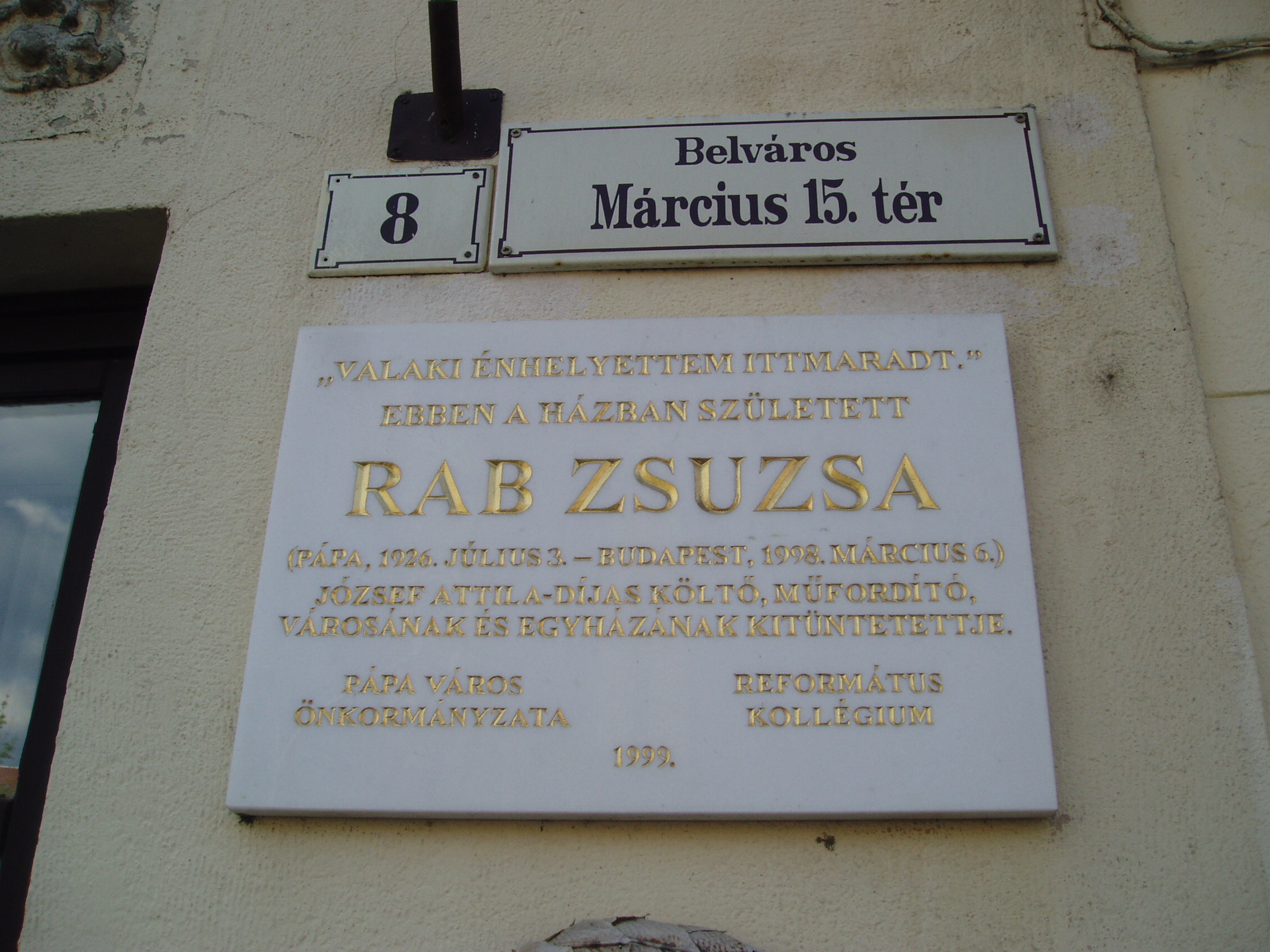 Nyilvános 1112 | 1724 | Pápa, Március 15. tér 8. | Az emeletes saroklakóház 1870 körül épült. Ebben a házban született 1923. július 3-án Rab Zsuzsa költő, műfordító. Édesapja, Rab István 1886-1957) a második világháborút megelőző időszakban a Pápai Református Kollégium Gimnáziumának (lásd: Pápa, Március 15. tér 9.) legendás hírű igazgatója, édesanyja a pápai templomépítő–gondnok, Jilek Ferenc lánya. Tanulmányait szülővárosában kezdte, majd 1944–ben a Kecskeméti Református Nőnevelő Intézetben érettségizett. A budapesti egyetem orvostudományi szakára iratkozott be, majd egy év elteltével a bölcsészkar orosz szakos hallgatója lett. A nyelvek, az irodalmak szépségével édesapja ismertette meg. Bizonyára nagy része volt abban, hogy a fiatal kamaszlány 16 éves korában saját verseskötetben tárta fel diáktársainak a szerelemről, otthonról, költészetről fogant lírai impresszióit. A fény felé című kötetet 17 évig nem követhette másik. A második világháború után megváltozott rendszerben Rab Zsuzsa egyetemi tanulmányaihoz állami támogatást nem kaphatott. Édesapját nyugdíj nélkül bocsájtották el, a családot osztályidegennek nyilvánították. Egyetemistaként takarításból, kisebb diákok tanításából, alkalmi munkákból élt. Tehetségének és kitartó szorgalmának köszönhetően 1955–ben robbanásszerűen tört be a műfordítás–irodalomba a magyar nyelven addig ismeretlen Szergej Jeszenyin verseinek fordításával. Ezután sorra jelentek meg műfordításai. Hihetetlenül gazdag életművet szakított félbe a halál 1998. március 5-én. Rab Zsuzsa szeretett iskolájára hagyta könyvtárának jelentős hányadát (a Petőfi u. 13. számú épületben, az ún. Ókollégiumban található), vagyonának egy részéből pedig létrehozta a Rab István Alapítványt, amellyel a latinban jeleskedő ifjakat kívánta támogatni. A fénykép 2007 áprilisában készült. Felh. irod.: Németh Adél - Szabó Lajos: Pápa. Bp. Panoráma, 1989 Rab Zsuzsa. = Olvadás. A Pápai Református Gimnázium diáklapja. 2003. 8. |