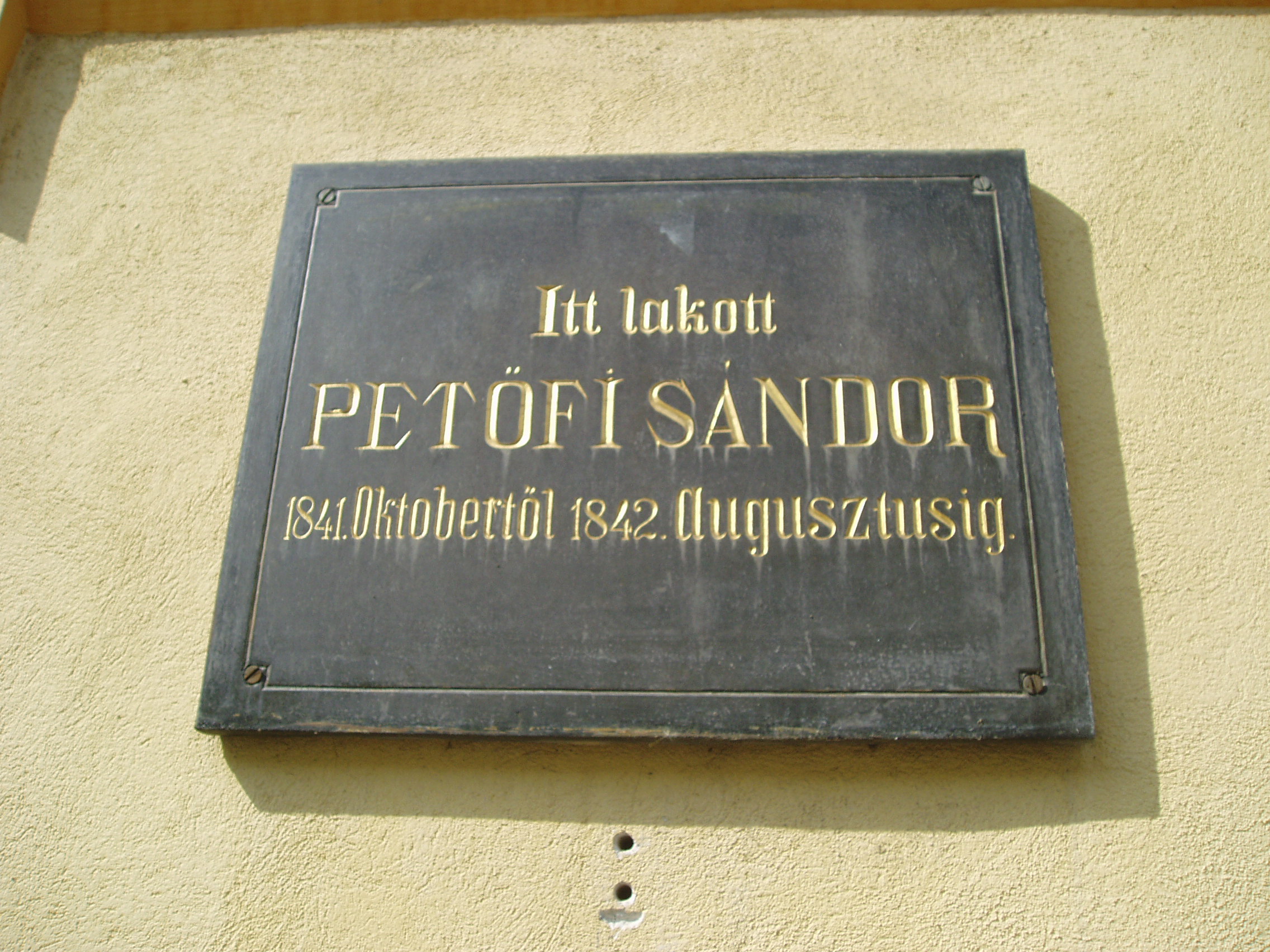 Nyilvános 1157 | 2214 | Pápa, Petőfi utca 11. | Klasszicista stílusban épült, műemlék jellegű lakóház áll az Ókollégium tőszomszédságában. Itt volt pápai diák korában Petőfi Sándor harmadik szállása, itt lakott a leghosszabb ideig. A ferences templommal (lásd: Pápa, Barát u. 1.) szemben lévő fűtetlen szobájából költözött ide, mégpedig az iskola igazgatóságának tudta nélkül, amiért megrovásban részesült. A házon lévő két feliratos tábla szerint 1841 októbere és 1842 augusztusa között lakott itt; a kezdő dátum azonban kérdéses, hiszen Orlai Petrich Soma szerint 1841 telén a ferences templommal átellenben, egy fűtetlen szobában laktak, s a zord időjárás miatt költöztek át ide, az iskola szomszédságába. Ekkoriban került be Petőfi és Orlai szűk baráti körébe Jókai Mór, aki majdnem annyit tartózkodott itt, mint saját lakásán (lásd: Pápa, Jókai u. 13.) Jókai nagy szeretettel emlékezett ezekre az együttlétekre: "Mindegyikünknek volt saját kedvenc szenvedélye: Orlayé a költészet, Petőfié a színpad, enyém a festőecset. Ha Orlay írt tüneményes regényjeleneteket, Petőfi meg elszavalta azokat, én képeket festettem hozzájuk... Egymásnak őszinte bámulói voltunk: Orlay megközelíté előttünk Jósika Miklóst, Petőfi is csak egy fokkal állt alább Egressynél [Egressy Gábor]..." Orlai így emlékezett: "Kis szobánknak egyetlen ablaka az utcára szolgált. De e kis helyen a 41. és 42. év telén és a reá következő nyár folyamán sok szépemlékű napokat éltünk át. Itt építgettük jövendőnk ábrándvárait, gyakran éjfelekig ... Néha e kis szobát a jóbarátok vidám zaja töltötte be, kik iskola előtt és után örömest tértek be hozzánk..." Ittlakásának idején, 1842 májusában jelent meg az Athenaeum c. országos folyóiratban A borozó című verse - elképzelhető, hogy ebben a házban írta, hiszen innét küldte el Pestre. Pápán is jelentek meg nyomtatásban versei - egyelőre név nélkül, a helyi Népbarát című közhasznú kalendárium 1843. évi kötetében. Erre az időre esett nagysikerű részvétele a Képzőtársaság nyilvános rendezvényén (lásd: Pápa, Fő u. 17.), ahol 3 arany pályadíjat nyert. Az eseményt a szállásával szemben lévő Három rózsa nevű kocsmában barátaival meg is ünnepelte... Ittlakásának időszakára esik választott új, halhatatlanná vált vezetéknevének felvétele is. Mint Nádasdy Lajos nyugalmazott református lelkész, helytörténész fogalmazott: "Petrovics Sándor Kiskőrösön született. Petőfi Sándor Pápán." A fénykép 2007 áprilisában készült. Felh. irod.: Németh Adél - Szabó Lajos: Pápa. Bp. Panoráma, 1989 Petőfi emlékhelyek a Kérpát-medencében. Kiskőrös, 1996, Petőfi Sándor Társaság "A kényes úrfi s a rongyos baka". Tanulmányok két halhatatlan pápai diákról. Pápa, 2001, Pápai Református Gyűjtemények |