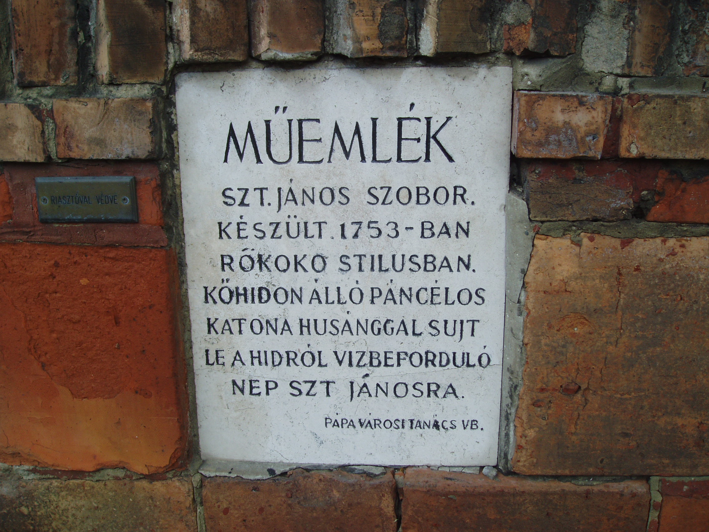 Nyilvános 1174 | 1851 | Pápa, Szent István út: Nepomuki Szent János szobra | A Várkertet határoló alacsony téglafal kerítés oldalában, az egykori vámházzal szemben áll a Nepomuki Szent Jánost ábrázoló rokokó stílusú kőszobor. 1755-ben készült, az akkori földesúr, Esterházy Károly faragtatta. Készítője azonos a Flórián szoboréval (lásd: Pápa, Flórián u.). Az átlagostól eltérően komponált szoborcsoport az Esterházy-címerrel díszített magas talapzaton áll. A talapzaton emelkedő kőhíd tövében puttók ülnek. A kőhídon álló páncélos katona husánggal sújt le a hídról a vízbe forduló Szent Jánosra. Nepomuki Szent János (csehül: Svatý Jan Nepomucký; Nepomuk /Csehország/, 1340 és 1350 között – Prága, 1393. március 20.) keresztény vértanú, Csehország védőszentje. Miután pappá szentelték, nemsokára prágai kanonok és érseki helyettes lett. IV. Vencel cseh király őt választotta gyóntatójául. Vencel gyanakodott feleségére és azt követelte Jánostól, hogy árulja el, mit gyónt a királyné. János a gyónási titok szentségére hivatkozva megtagadta a király kívánságát. A király azt is nehezményezte, hogy egy apátválasztást az ő tudta nélkül, mint érseki helyettes megerősített. Mindezért elfogatta, megkínoztatta és a Moldva folyóba dobatta Jánost. 1729-ben XIII. Benedek pápa avatta szentté. A fénykép 2007 áprilisában készült. Felh. irod.: Németh Adél - Szabó Lajos: Pápa. Bp. Panoráma, 1989 www.wikipedia.org |