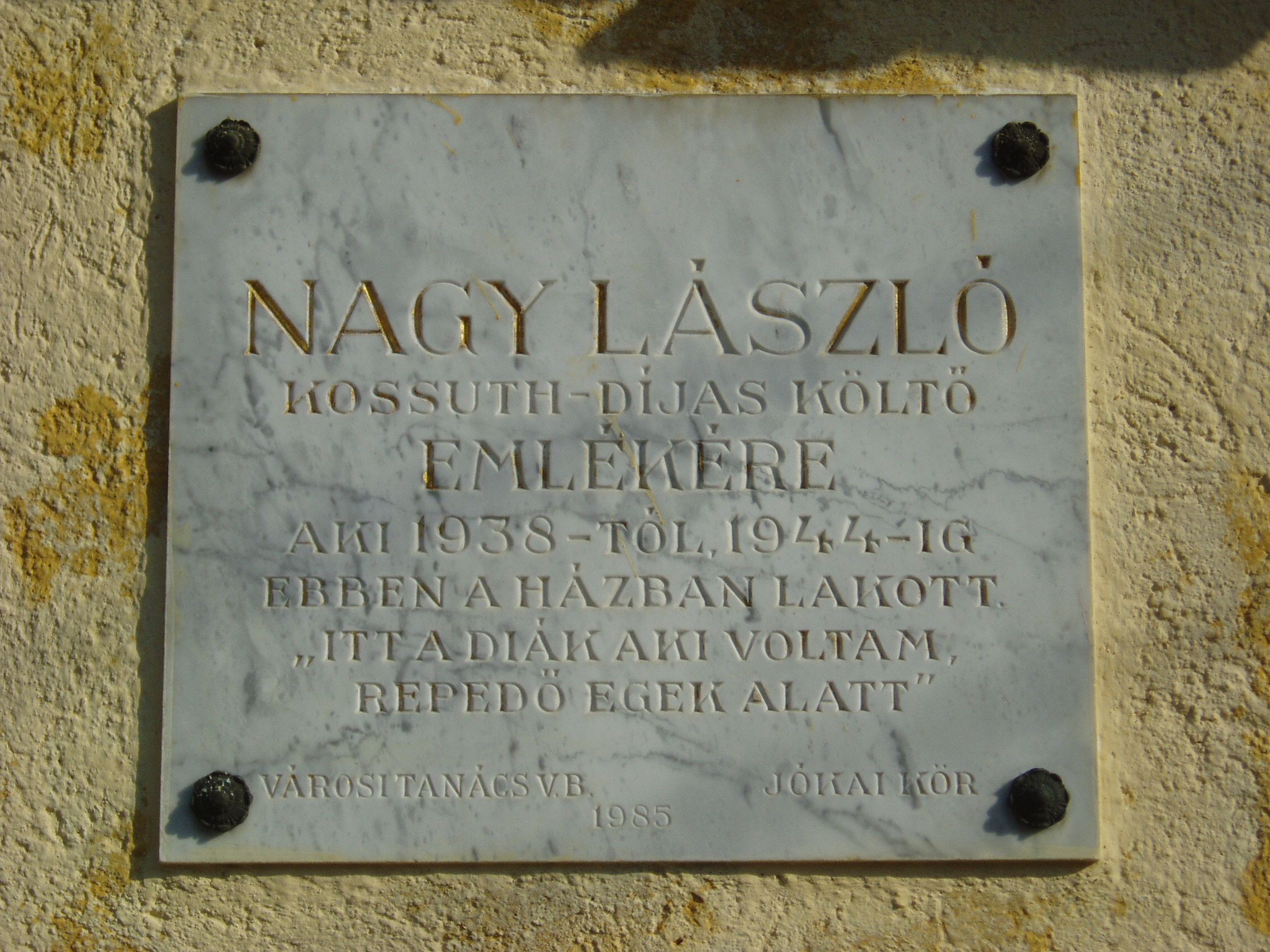 Nyilvános 1111 | 1704 | Pápa, Világos utca 20. | Mint a homlokzaton lévő emléktáblán olvasható, pápai diákévei idején, 1938-1944 között ebben a házban lakott Nagy László (1925-1978) költő. Szülőfalujában, Iszkázon végzett elemi iskolai tanulmányait tíz éves korában, 1935-ben bekövetkező súlyos betegsége két évre félbeszakította, azóta járógéppel járt. 1938 őszétől Pápán tanult tovább. Már nővérei is ott jártak iskolába, s Nagy László is csatlakozott hozzájuk. Anyai nagyanyja felügyelete alatt ebben a házban lakott, testvérei és unokatestvérei körében, nyolcadmagával. A kicsi szobában már nem jutott neki hely, ő a konyhában, azon az asztalból átalakított ágyon feküdt, amelyet jókedvükben meseautónak neveztek el. Balázs Mihály így festi a kamaszfiú pápai mindennapjait, közben a költő egyik testvérét is idézve: "A nagymama akkora fazék káposztákat főzött nekik, hogy három napig is rájártak. Mindig éhesek voltak, megették volna a 'vasszöget is'. Az idősebbik leánytestvér mesélte: 'Nagyon sok mákos és diós kalácsot meg tudtunk volna enni, de mindig elosztva kaptuk. Lackónak a nyárádi lányok egy dolgozatért, rajzcsinálásért odaadták a részüket. Ügyes keze miatt minden plakátot, rajzot ő készített.'" A költő a polgári fiúiskolába, majd 1941 őszétől a kereskedelmi iskolába (lásd: Pápa, Március 15. tér 9.) járt. Iskolaéveit megcsonkította a háború. 1945 júniusában érettségizett le. A házat, amely egyébként nagyon hasonlít arra, amelyik annakidején Petőfinek adott szállást (lásd: Pápa, Petőfi u. 11.), 1985-ben jelölték meg emléktáblával. Rajta a költő egy sora olvasható: "Itt a diák aki voltam, repedő egek alatt". A fénykép 2007 áprilisában készült. Felh. irod.: Balázs Mihály: Szülőföld és iskola. Írók, költők gyermek- és ifjúkora. Bp. Korona Kiadó, 1996 |