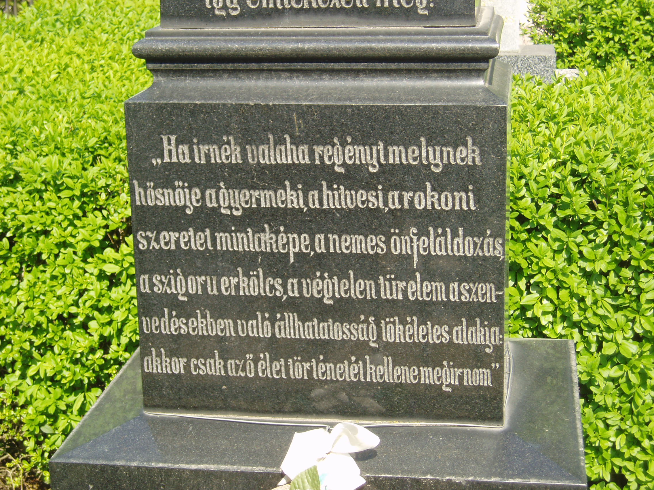 Nyilvános 1392 | 3784 | Rövid leírás | Teljes leírás (1.5 KB) | Pápa, Alsóvárosi temető: Vály Mari sírja A Jókai utcáról nyíló Temető utca vezet a XIX. század elején megnyílt Alsóvárosi köztemetőbe. A város sok neves személyiségének van itt a sírja. Itt nyugszik Vály Mari (Komárom, 1840. nov. 17. – Pápa, 1915. máj. 17.) emlékiratíró, Jókai Mór unokahúga (Eszter nővérének lánya, apja Vály Ferenc tanár). Férjének és gyermekének korai halála után Jókaiékhoz költözött, háztartásuk vezetésében segédkezett. Nagybátyja életét terjedelmes emlékiratban örökítette meg, amelyből szemelvényes kiadásban jelent meg: Emlékeim Jókai Mórról címmel csak részletek jelentek meg 1955-ben. Sírkövén nagybátyjának sorai olvashatók. Ugyanitt nyugszik férje, Peti József (Komlósd, 1831. okt. 24. – Pest, 1862. aug. 22.) tanár. Tanulmányait Csurgón kezdte, 1850-től Pápán, Bécsben és Bazelben folytatta, ahol teológiát is hallgatott. A pápai gimnáziumban 1856-ban, egy év múlva Kecskeméten, 1859-től Pesten a teológia tanára. A Duna-melléki Egyházkerület 1861-ben aljegyzővé választotta. Több tudományos értekezést írt, melyek a tiszántúli egyházi folyóiratokban és évkönyvekben jelentek meg. A fénykép 2007 áprilisában készült. Felh. irod.: Németh Adél - Szabó Lajos: Pápa. Bp. Panoráma, 1989 Veszprém megyei életrajzi lexikon. Veszprém, Veszprém Megyei Önkormányzat Közgyűlése, 1998 |