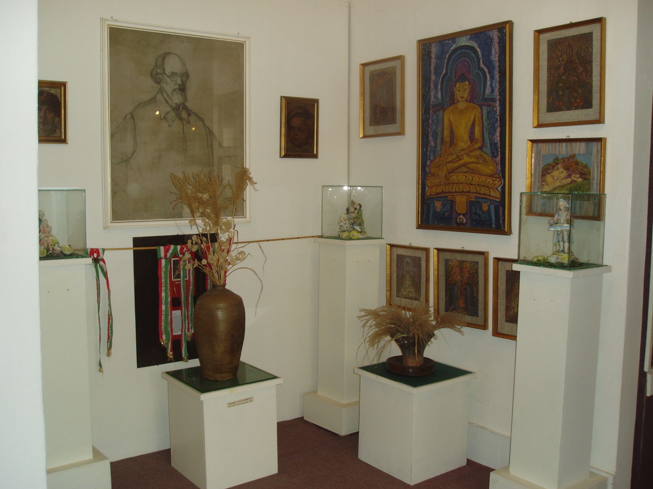 Nyilvános 1119 | 1762 | Sümeg, Kisfaludy tér 2. Városi Múzeum, Sass Brunner-emlékszoba | A Városi Múzeum ad otthont a Sass Brunner emlékkiállításnak is, amely Sass Brunner Ferenc, felesége, Sass Brunner Erzsébet és leányuk, Brunner Erzsébet festészeti munkáit mutatja be. Sass Brunner Ferenc az első világháború után telepedett le Sümegen (lásd még: Sümeg, Szent István tér 3., Sümeg, Temető). Nagykanizsai származású felesége és lánya 1928-ban Indiába utaztak és ott éltek életük végéig. Munkásságuk mára joggal bevonult a XX. század indiai festészetének klasszikusai közé. A kiállítás képanyaga jórészt Elizabeth Brunner adományaként került a múzeum tulajdonába. A művészektől a nagykanizsai Művészetek háza ("kiskastély") is őriz festményeket. A fénykép 2007 júniusában készült. Felh. irod.: Sümegi kalauz. Sümeg, Sümegi Fórum Alapítvány, 1993 |