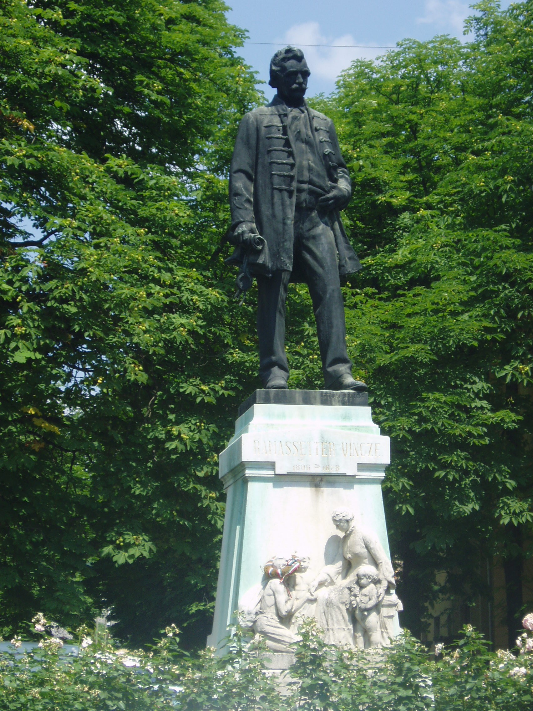Nyilvános 1093 | 1823 | Sümeg, Kossuth utca 13. Ramssetter Vince szobra | Sümeg legforgalmasabb pontján, a Kisfaludy szálloda és a Kisfaludy Gimnázium (lásd: Sümeg, Mártirok útja 1.) között 1908-ban állították fel Sümeg nagy fiának, a város jótevőjének, Ramassetter Vincének egészalakos szobrát, Istók János alkotását. Ramassetter Vince (Sümeg, 1806-Sümeg, 1878) Kőszegen és Győrött járt iskolába, majd folytatva a Németalföldről betelepült apja mesterségét, ő is kékfestő lett. Később áttért a szőlőtermesztésre és a borkereskedelemre, amelyhez kádárműhelyt tartott fenn. 1848-ban Sümeg polgármesterévé választották. 1846-ban az iparostanoncok oktatására, 1855-ben pedig egy reáliskola támogatására hozott létre alapítványt. Vagyona nagyobb részét Sümeg városára, az oktatási és az egészségügyi intézmények fenntartására hagyta. A városban több emléktáblája is van (lásd: Sümeg, Árpád u. 5., Deák F. u. 8., Mártirok u. 1., Panteonfal, Ramassetter u. 10.). Sírja a helyi köztemetőben található (lásd: Sümeg, Temető), utca is őrzi nevét. A szobor talapzatán lévő dombormű feleségét, Kompanik Zsófiát ábrázolja, aki jótékonysági, városfejlesztő tevékenységében méltó társa volt férjének. Róla nevezték el a kórház utcáját. A fénykép 2007 júniusában készült. Felh. irod.: Koppány Tibor - Kozák Károly: Sümeg útikalauz. Veszprém, Idegenforgalmi Hivatal, 1965 Látnivalók Veszprém megyében. Miskolc, Well-PRess, 2004 Sümegi kalauz. Sümeg, Sümegi Fórum alapítvány, 1993 |