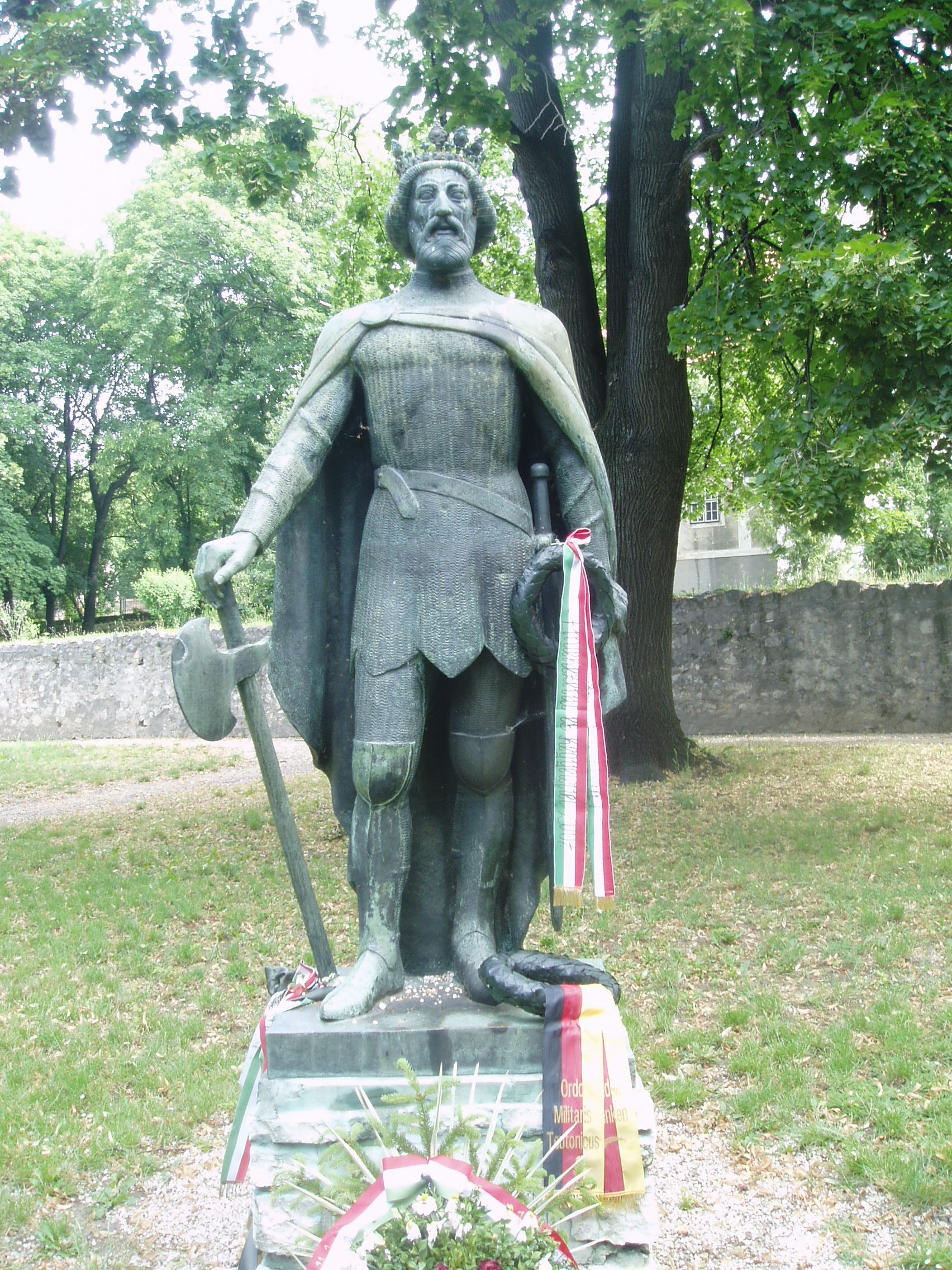 Nyilvános 1130 | 2038 | Sümeg, Népkert: Szent László király szobra | A Püspöki palotától (lásd: Sümeg, Szent István tér 10.) délkeletre terül el a Népkert, amely annakidején a palota díszkertje volt. Itt áll Oláh Sándor Szent László királyt ábrázoló egészalakos szobra. A műalkotást 1990-ben a Honvédelmi Minisztérium és a Hadtörténeti Múzeum ajándékozta Sümeg városának. Érdekesség, hogy 1606-tól 50 éven keresztül a sümegi ferences templomban (lásd: Sümeg, Szent István tér 7.) őrizték a török elől megmentett Szent László-hermát. A fénykép 2007 júniusában készült. Felh. irod.: Koppány Tibor - Kozák Károly: Sümeg útikalauz. Veszprém, Idegenforgalmi Hivatal, 1965 Történeti emlékek Veszprém megyében. = www.ekmk.hu/emlekhely/Emlekhelyek/h_olv.html Látnivalók Veszprém megyében. Miskolc, Well-PRess, 2004 Sümegi kalauz. Sümeg, Sümegi Fórum alapítvány, 1993 |