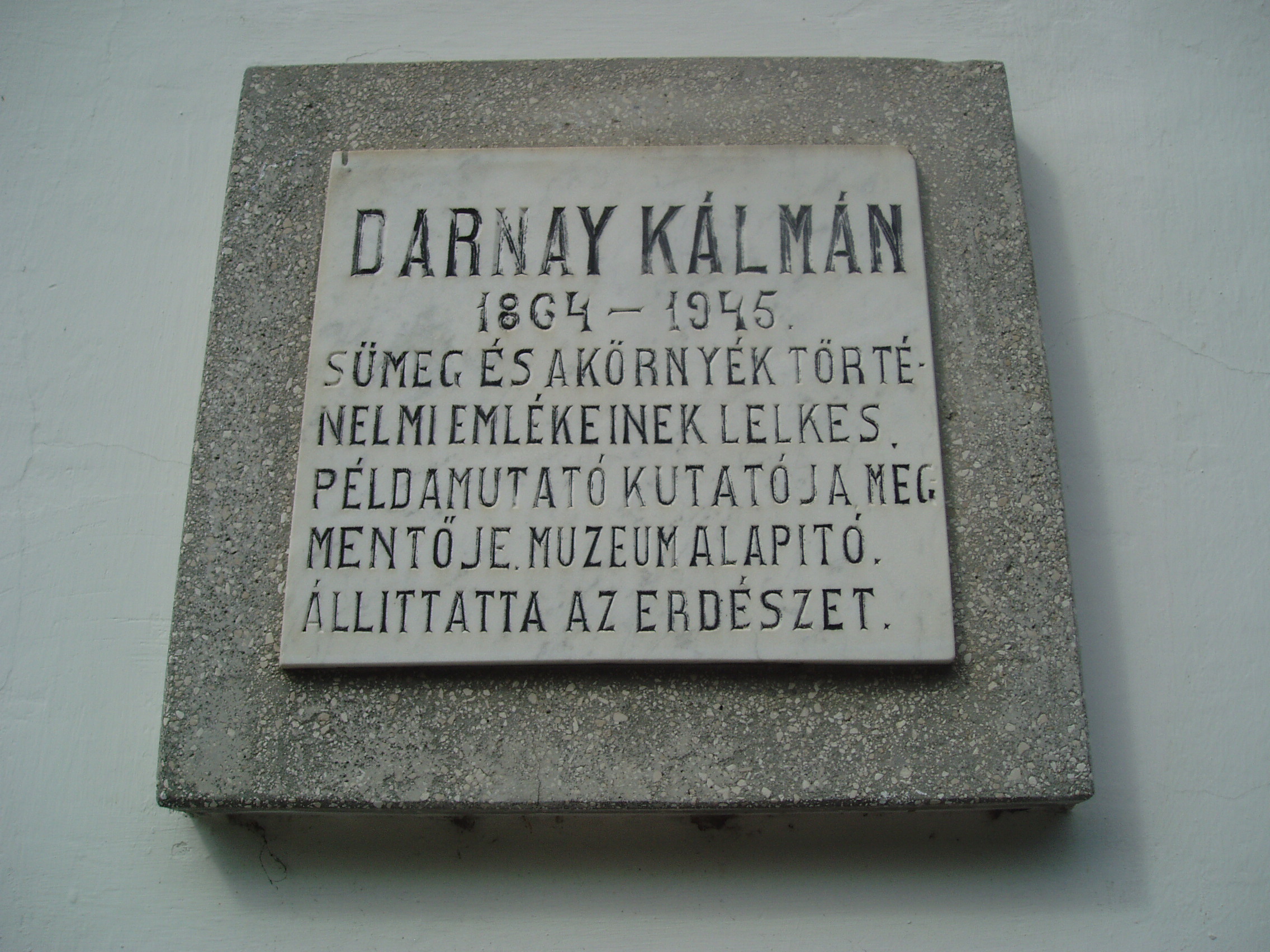 Nyilvános 1150 | 1701 | Sümeg, Panteonfal. Darnay Kálmán emléktáblája | A Kisfaludy téren, Kisfaludy Sándor szülőháza előtt alakították ki Sümeg Panteonfalát. A képen Darnay Kálmán emléktáblája látható (1955). Felirata: DARNAY KÁLMÁN 1864-1945 Sümeg és a környék történelmi emlékeinek lelkes, példamutató kutatója, megmentője, múzeumalapító. Állíttatta az Erdészet Darnay Kálmán (Sümeg, 1864. máj. 11. – Sümeg, 1945. júl. 3.) író, régész, múzeumalapító. Sümegi és grázi tanulmányok után vaskereskedőként kezdte pályáját, de igazi szenvedélye a régészet volt. Sümeg környékén jelentős ásatásokat folytatott, az ő műve a csabrendeki és a somlói urnatemető feltárása. Ezek leletek képezték gyűjteményének alapját, amelyet 1907-ben az államnak ajándékozott - sajnos, nagy része 1945-ben megsemmisült. A fénykép 2007 júniusában készült. Felh. irod.: Koppány Tibor - Kozák Károly: Sümeg útikalauz. Veszprém, Idegenforgalmi Hivatal, 1965 Látnivalók Veszprém megyében. Miskolc, Well-PRess, 2004 Veszprém megyei életrajzi lexikon. Veszprém, Veszprém Megyei Önkormányzat Közgyűlése, 1998 www.ekmk.hu/emlekhely/Emlekhelyek.html |